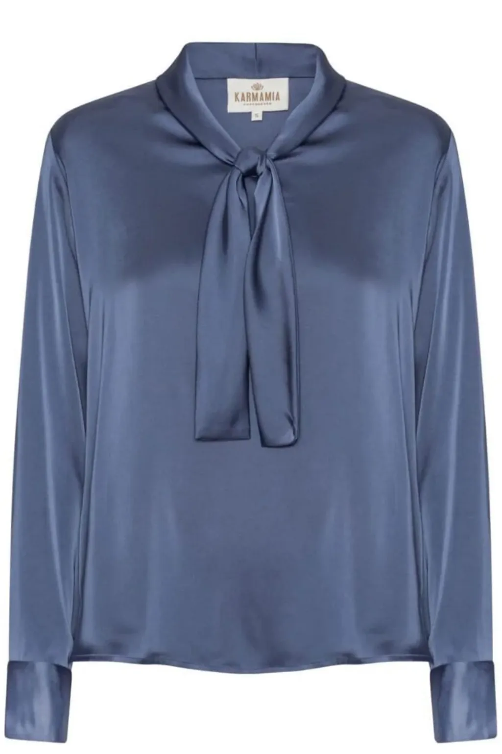 Blå bluse fra Karmamia i skinnende materiale. Designet med skjortekrave og slipsedetalje ved halsen. Lange ærmer med manchetter giver blusen et klassisk snit.