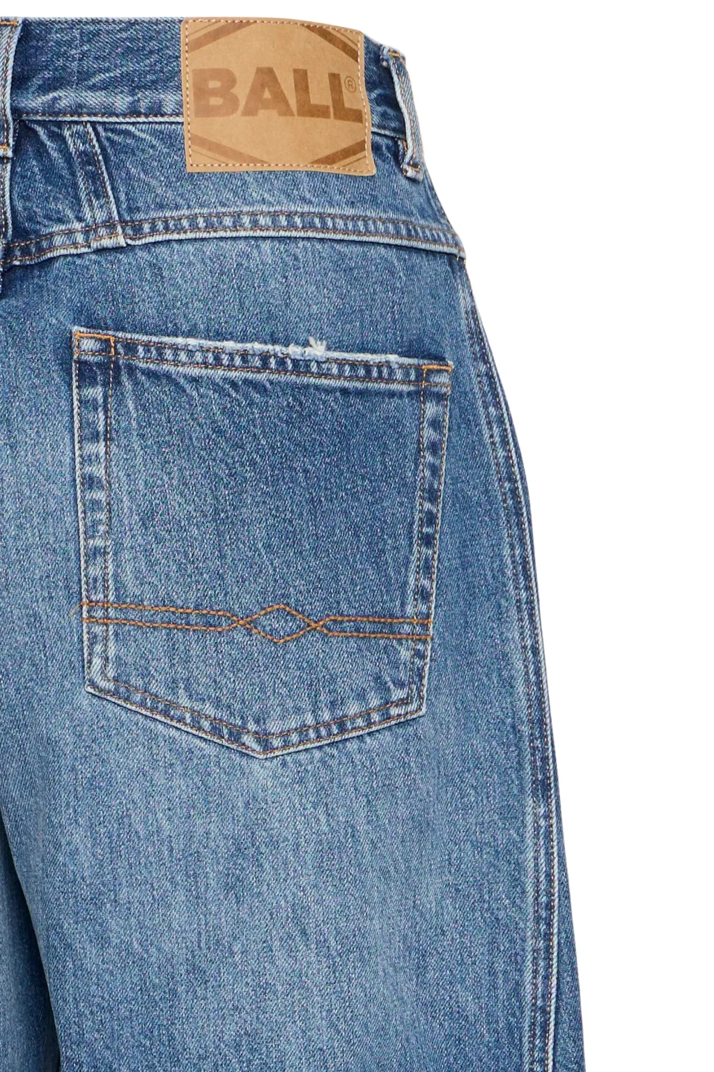 Jeans fra Ball i mellemblå bomuld med høj talje og løs pasform. Jeansene har klassisk fem-lomme-design og dekorative syninger.
