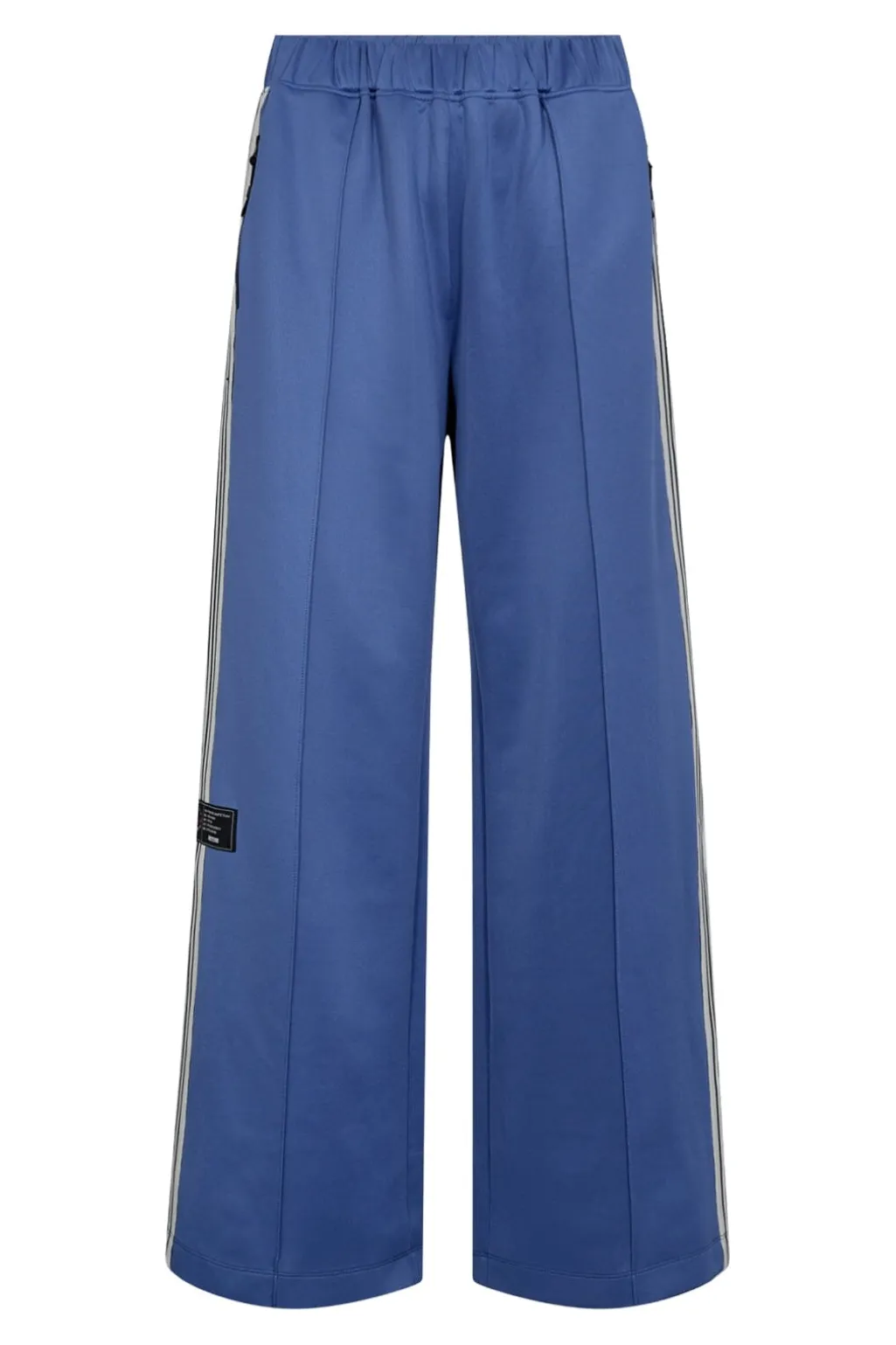 Blå baggybukser fra Haute L’Amitié, lavet af 100 % polyester. Bukserne har sporty striber i sort og hvid på siderne.