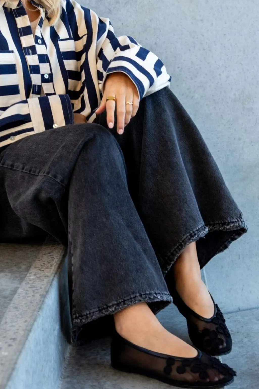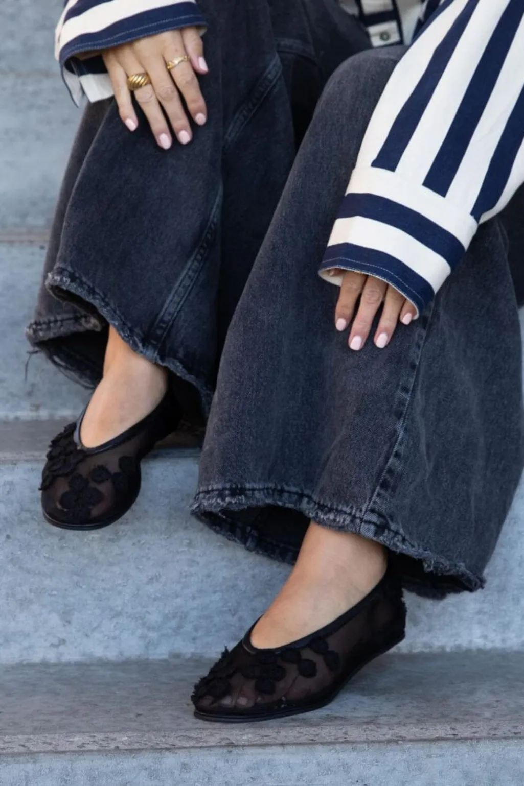 Sort ballerina sko med gennemsigtig mesh-overdel og blomsterbroderier. Skoen har en lav hæl og er lavet af læder med fine detaljer.