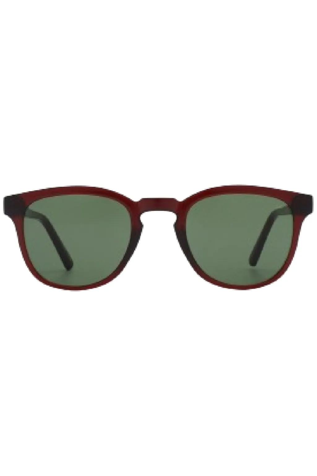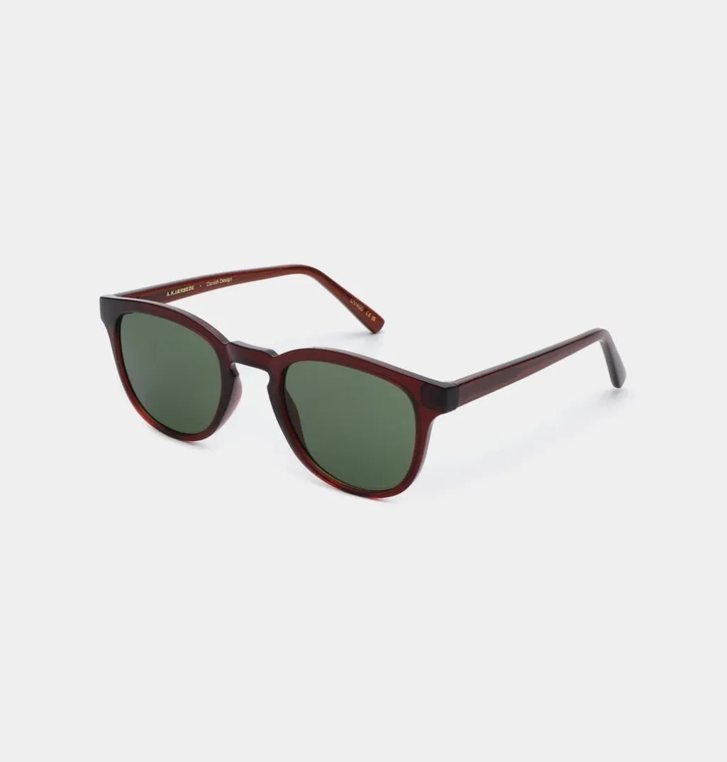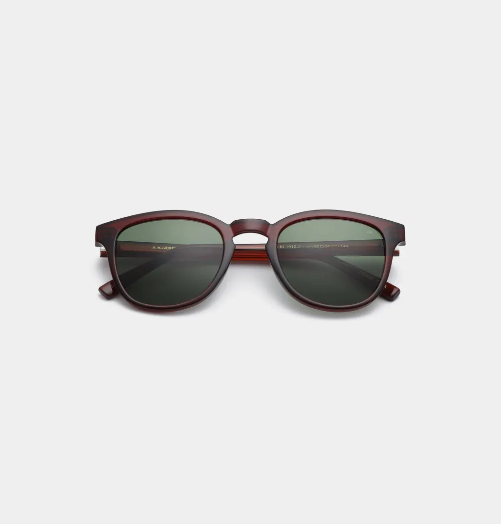 Brun transparent solbrille fra A. Kjærbede med grønne linser. Solbrillen har en klassisk wayfarer-form med optiske hængsler og formbare stænger med metalkerner.