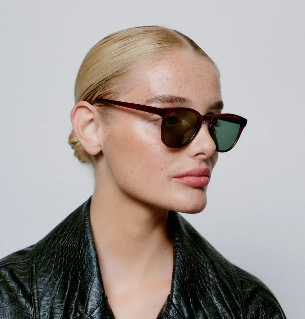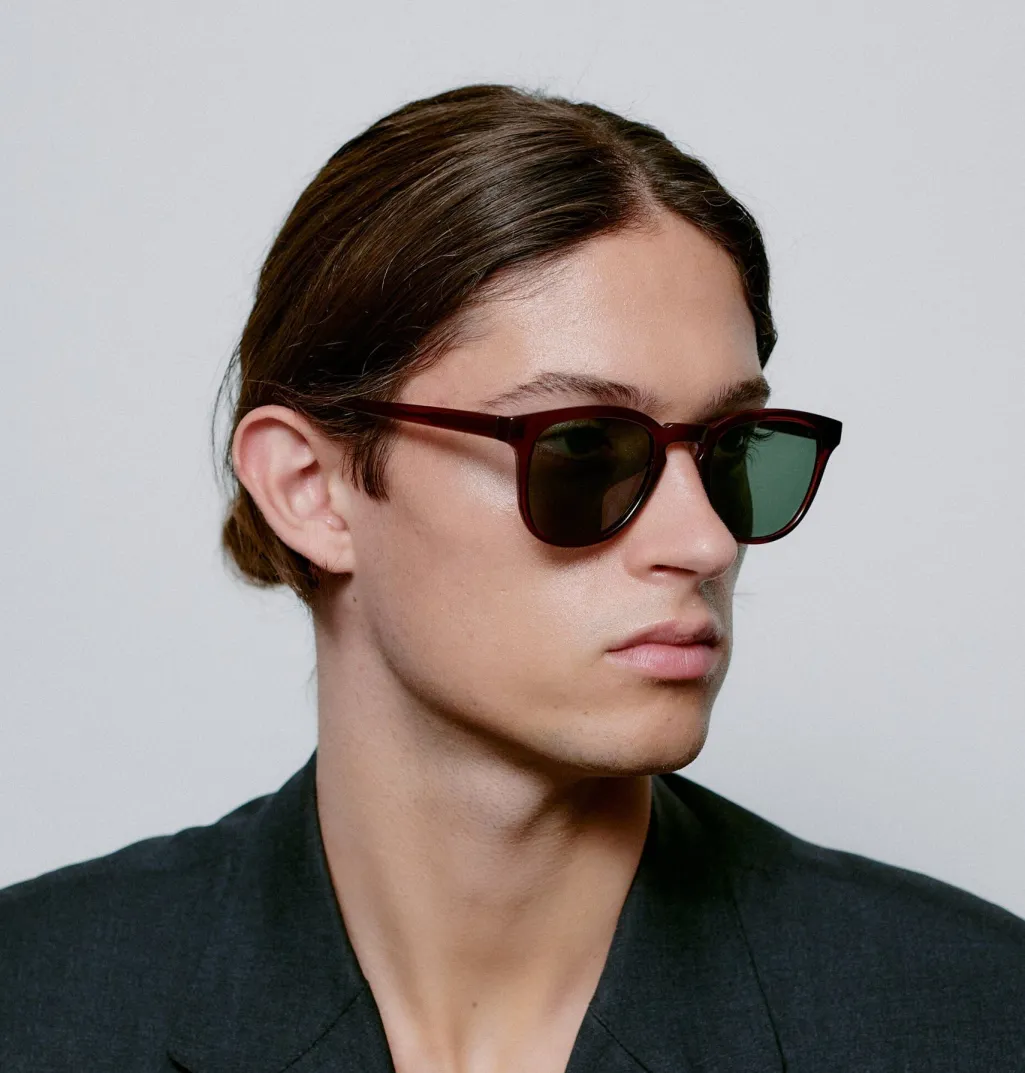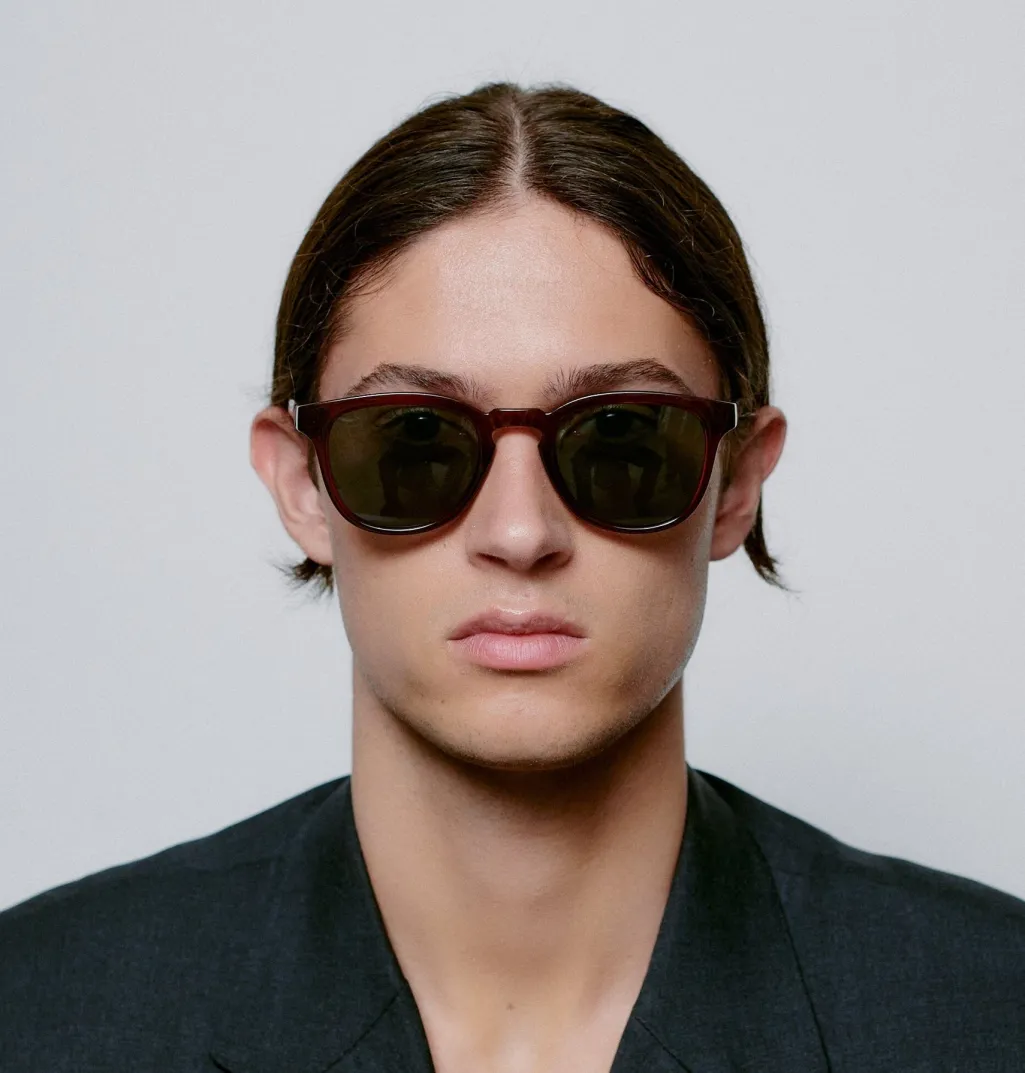 Brun transparent solbrille fra A. Kjærbede med grønne linser. Solbrillen har en klassisk wayfarer-form med optiske hængsler og formbare stænger med metalkerner.