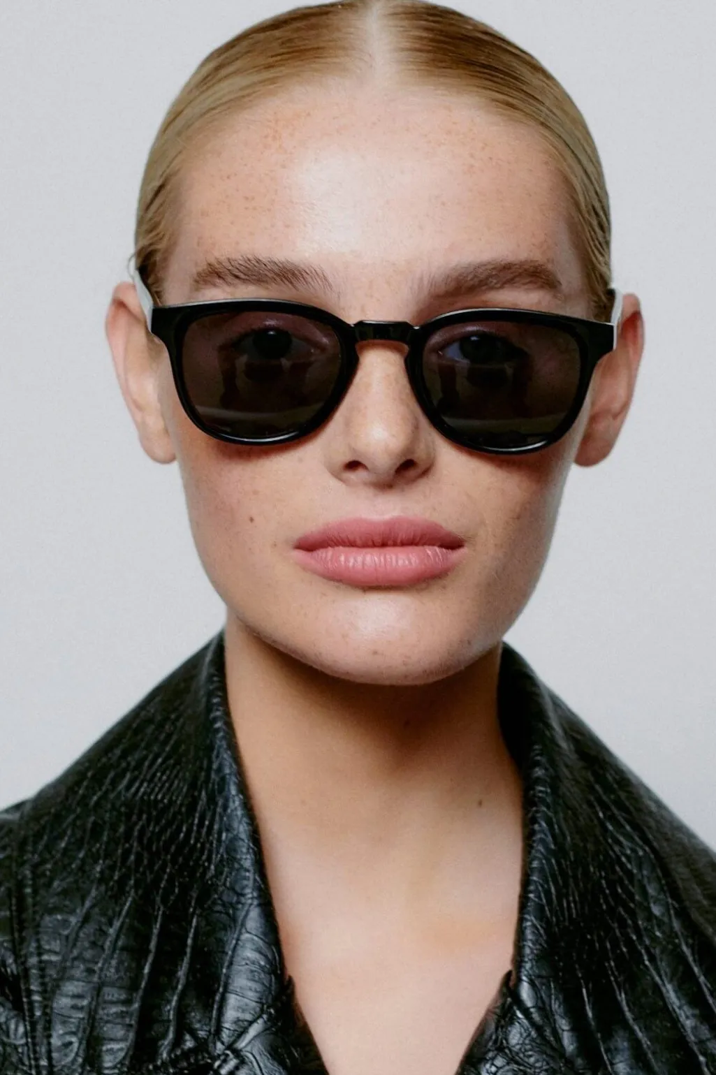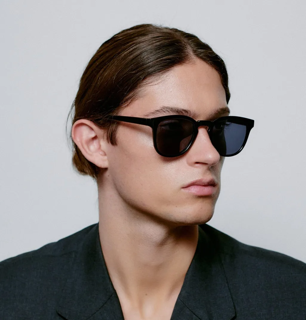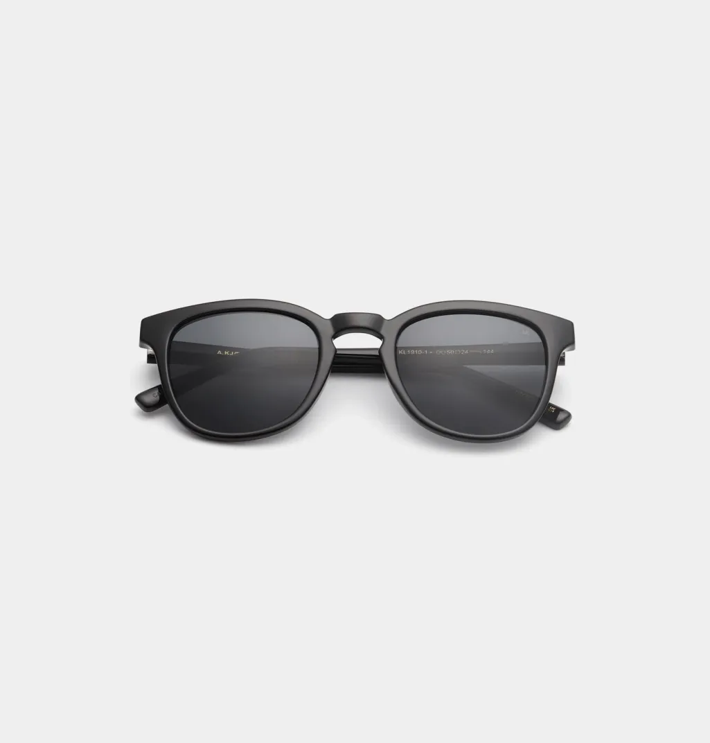 Sorte solbriller fra A. Kjærbede i Wayfarer-form. Stellet er lavet af Tritan Renew med polycarbonatlinser og UV400-beskyttelse. Brillerne har formbare stænger med metalkerner.