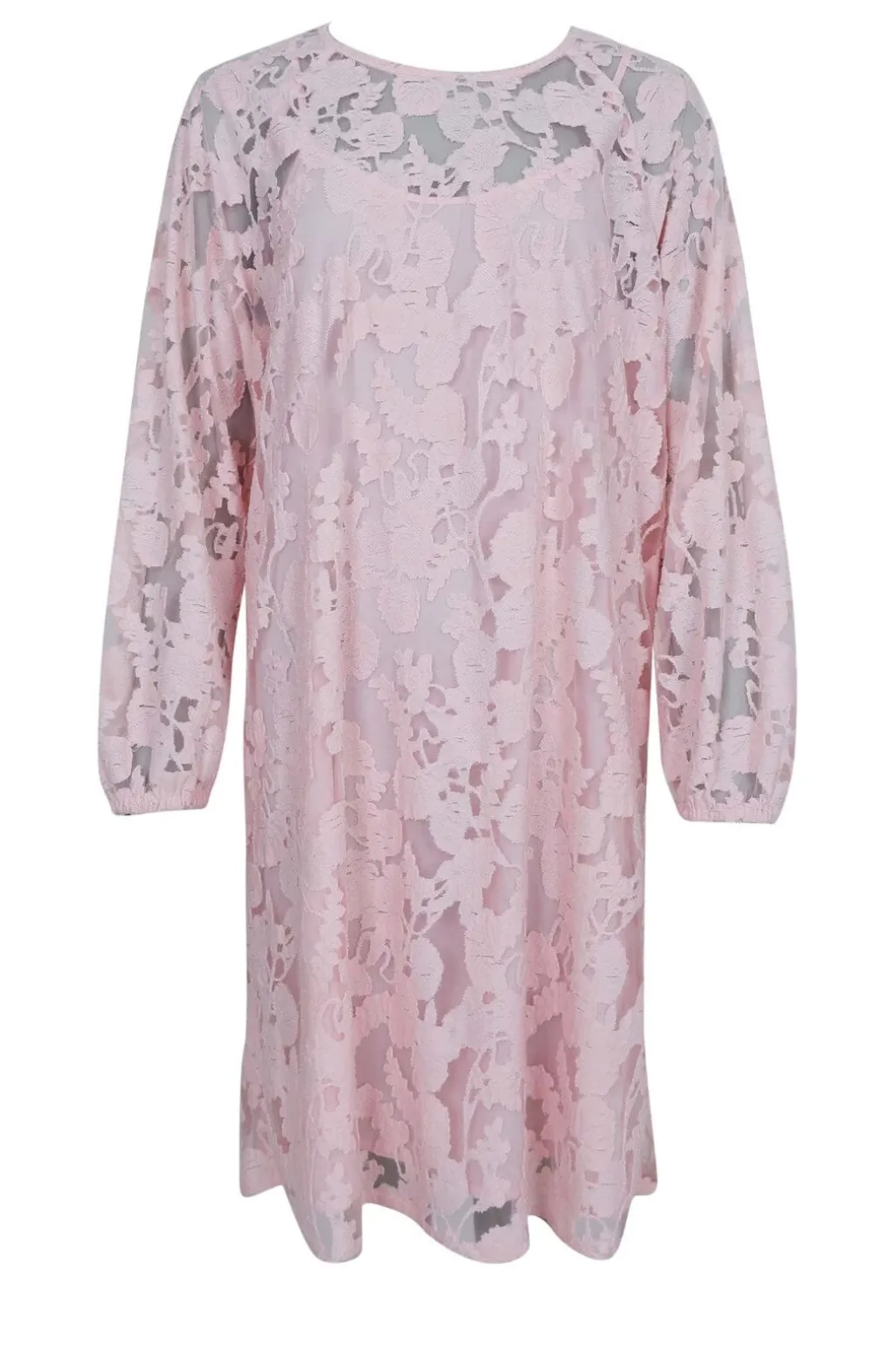 Blondekjole fra Black Colour i lys rosa. Kjolen har et gennemgående blondemønster, lange ærmer og knælængde med rund halsudskæring.
