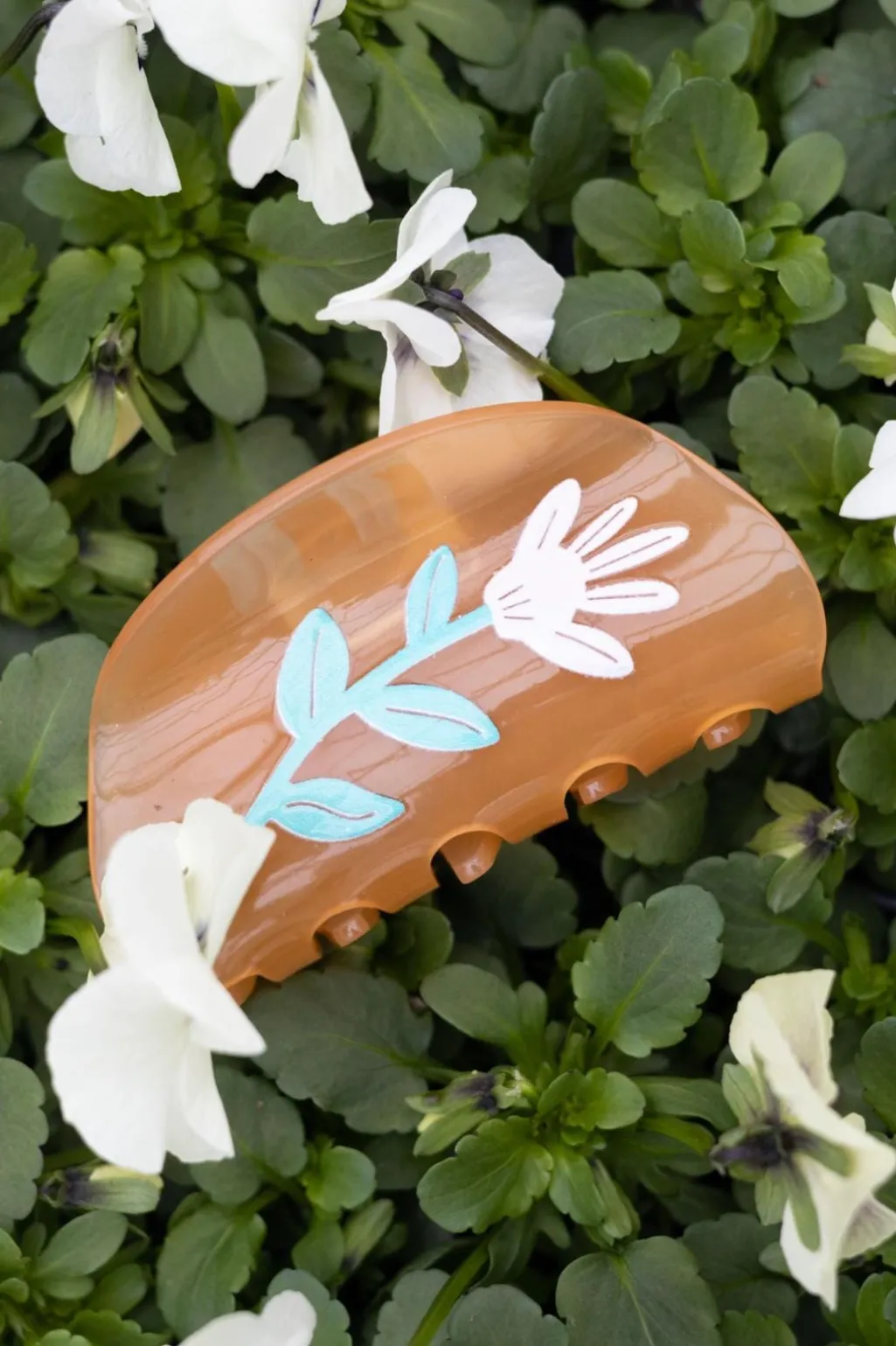 Hårspænde fra Black Colour i ferskenfarve med turkis og hvidt blomstermotiv. Den stærke klemme holder håret sikkert på plads hele dagen.