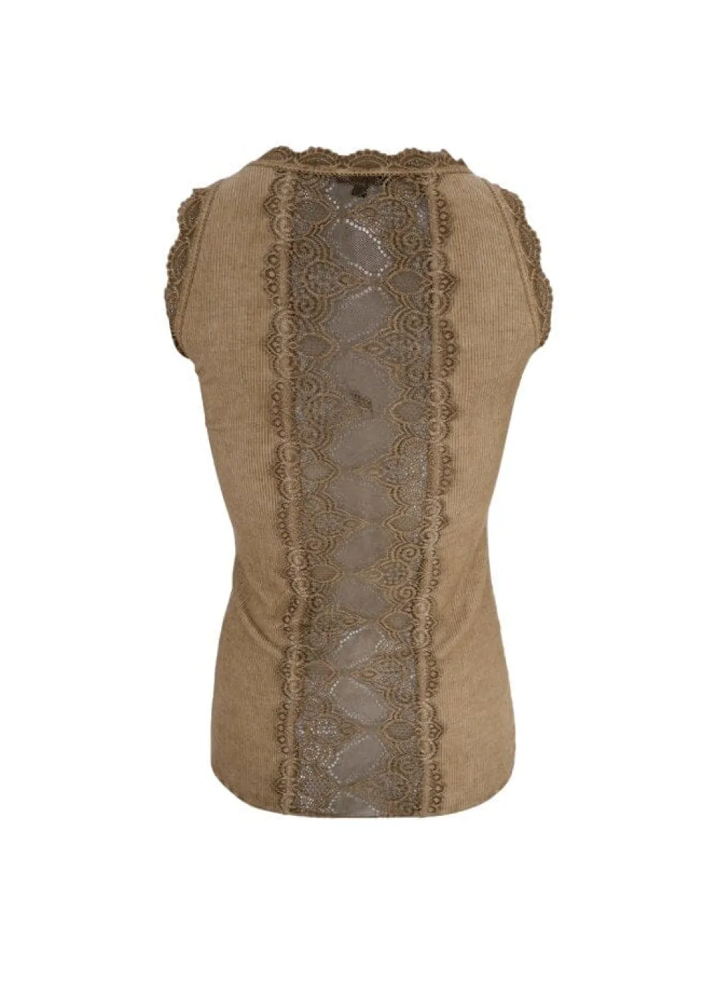 Ribbet top fra Black Colour i champagnefarvet viscose med blondekanter ved ærmegab og hals. Et blondepanel på ryggen giver toppen et feminint præg.