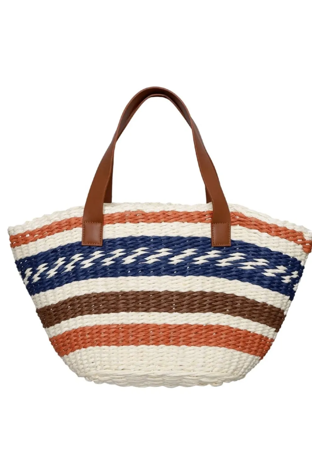 Strandtaske fra Black Colour i naturfarvet strå med maritime striber i cream, navy, hvid, blå og orange. Tasken har brune læderhanke og en åben top.