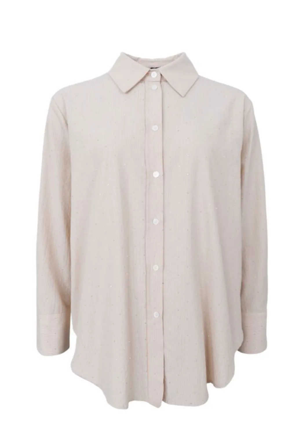 Cremefarvet skjorte fra Black Colour med pinstripe-mønster og pailletter. Skjorten har en løs pasform og lange ærmer med klassisk skjortekrave og knaplukning.