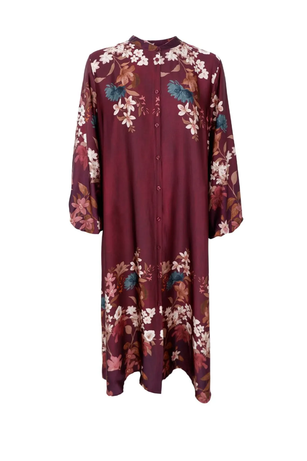 Satinkjole fra Black Colour i bordeaux med blomstermønster. Kjolen har skjortekrave, knapper hele vejen ned foran og 3/4 ærmer. Den løse model går til midt på læggen.