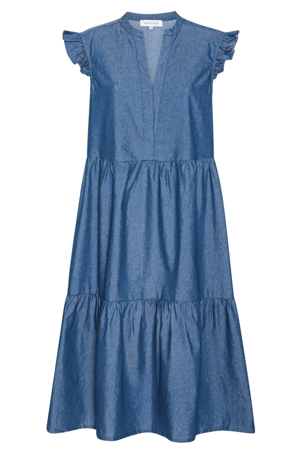 Lang kjole fra Continue i medium blå. Kjolen har v-udskæring, rynkede ærmer og et lagdelt design med flydende fald fra taljen og ned.