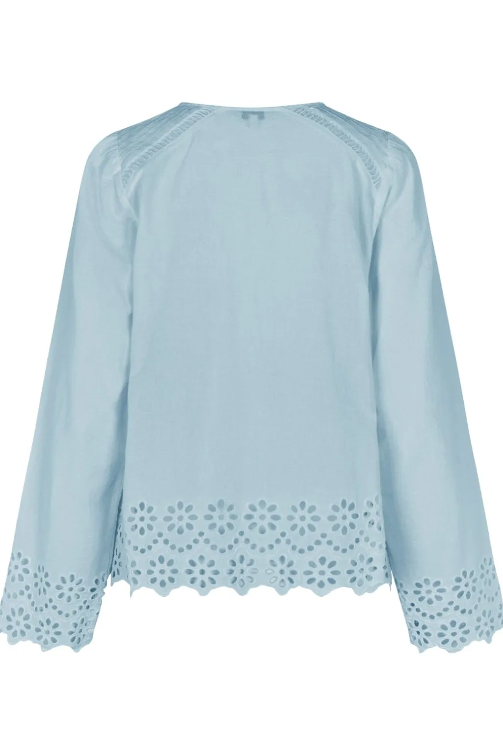 Lyseblå bluse fra MbyM i bomuld med v-udskæring og lange ærmer. Blusen har blomsterbroderi langs kanten og dekorative folder ved udskæringen.
