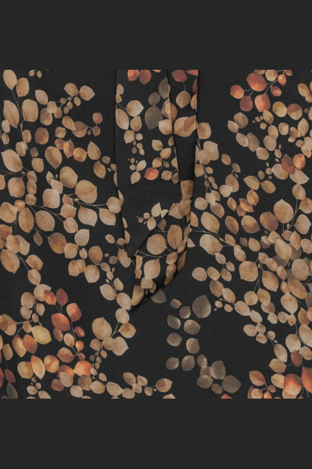 Lang nederdel fra Karmamia med blomsterprint i brune og orange nuancer på sort baggrund. Den har flæsekant forneden og bindebånd i taljen.
