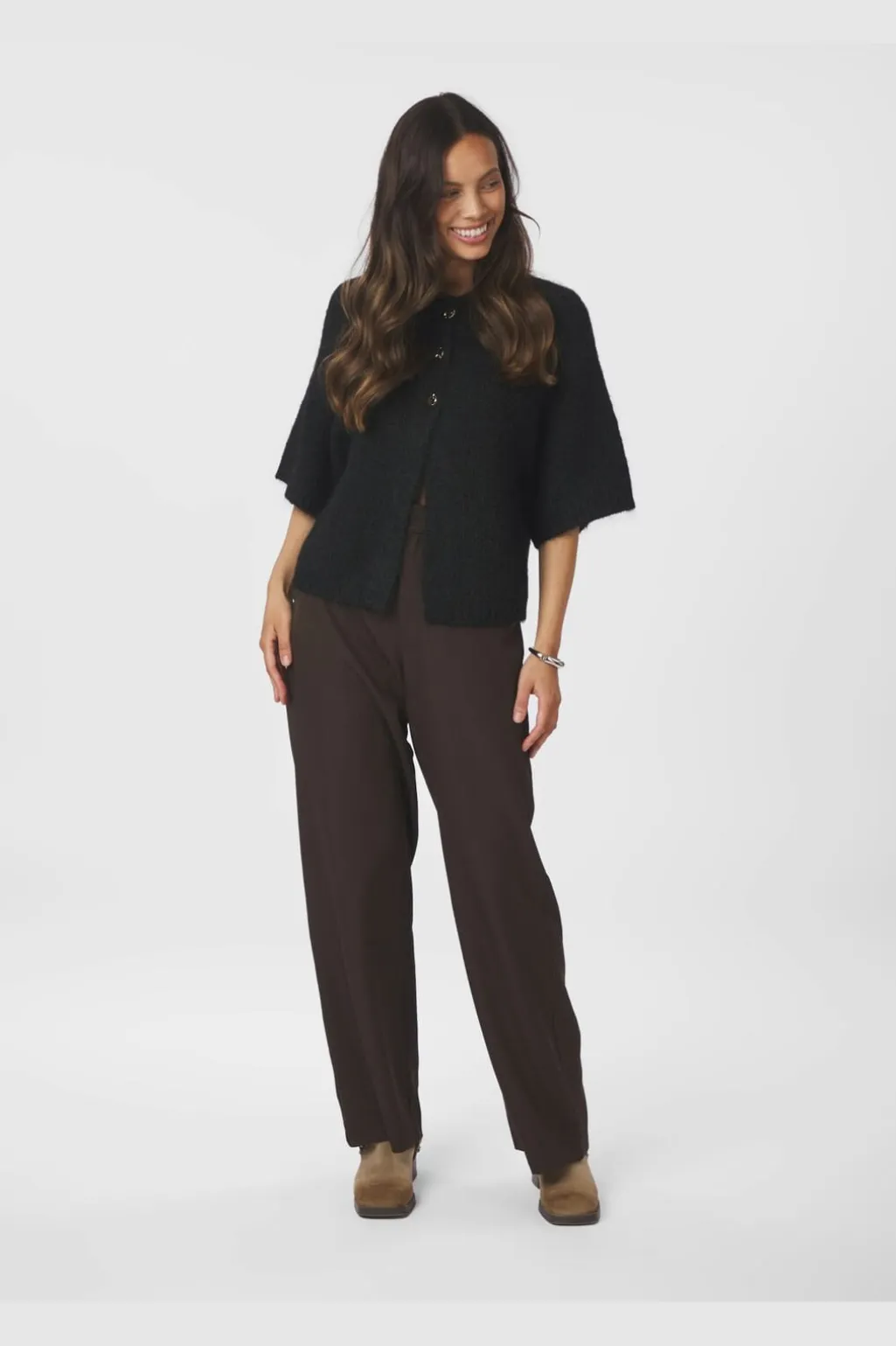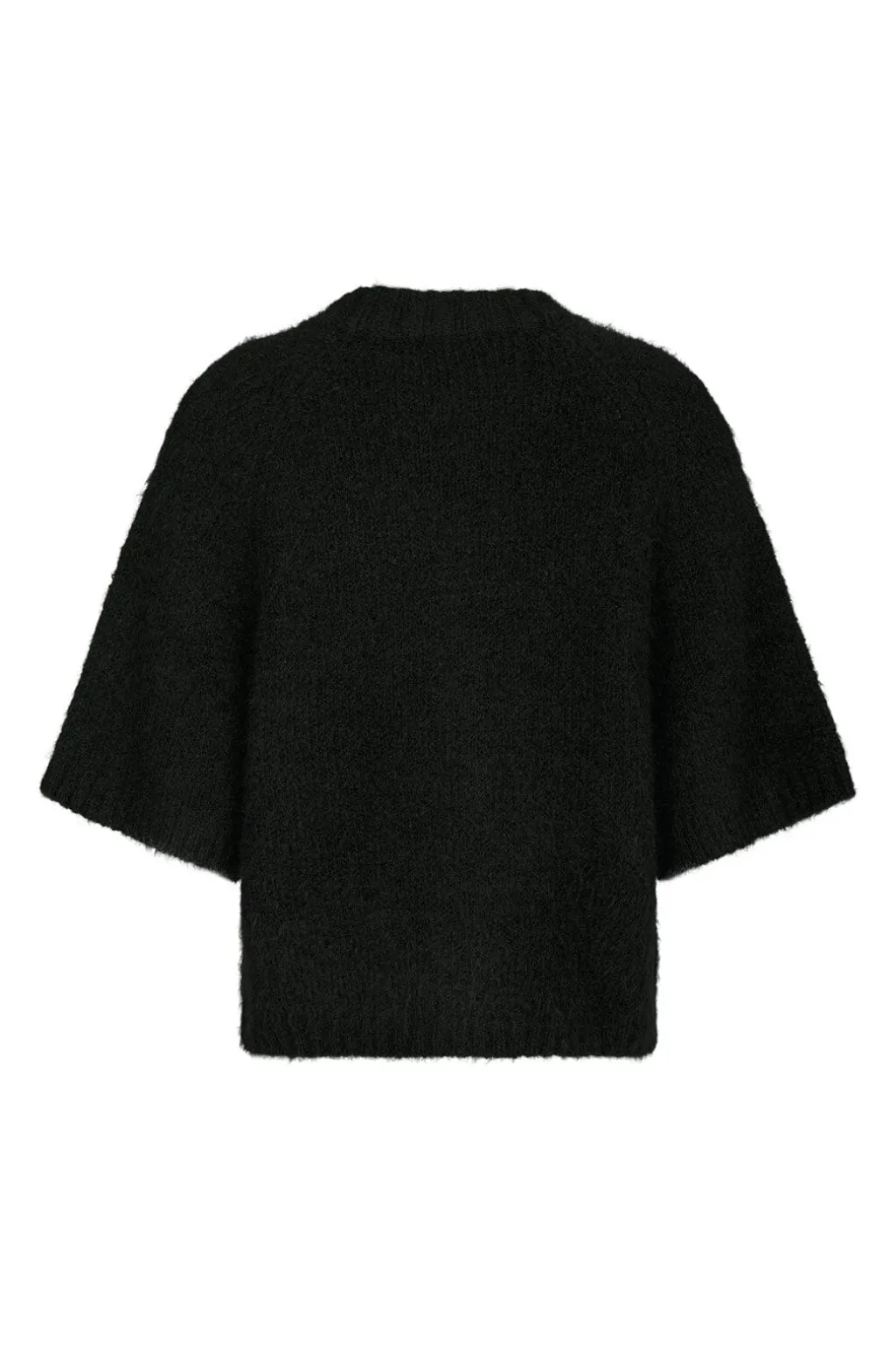 Sort cardigan fra Neo Noir i en blød, fluffy strikkvalitet. Den har en løs pasform med boxy silhuet og korte ærmer. Gyldne knapper pryder forsiden.