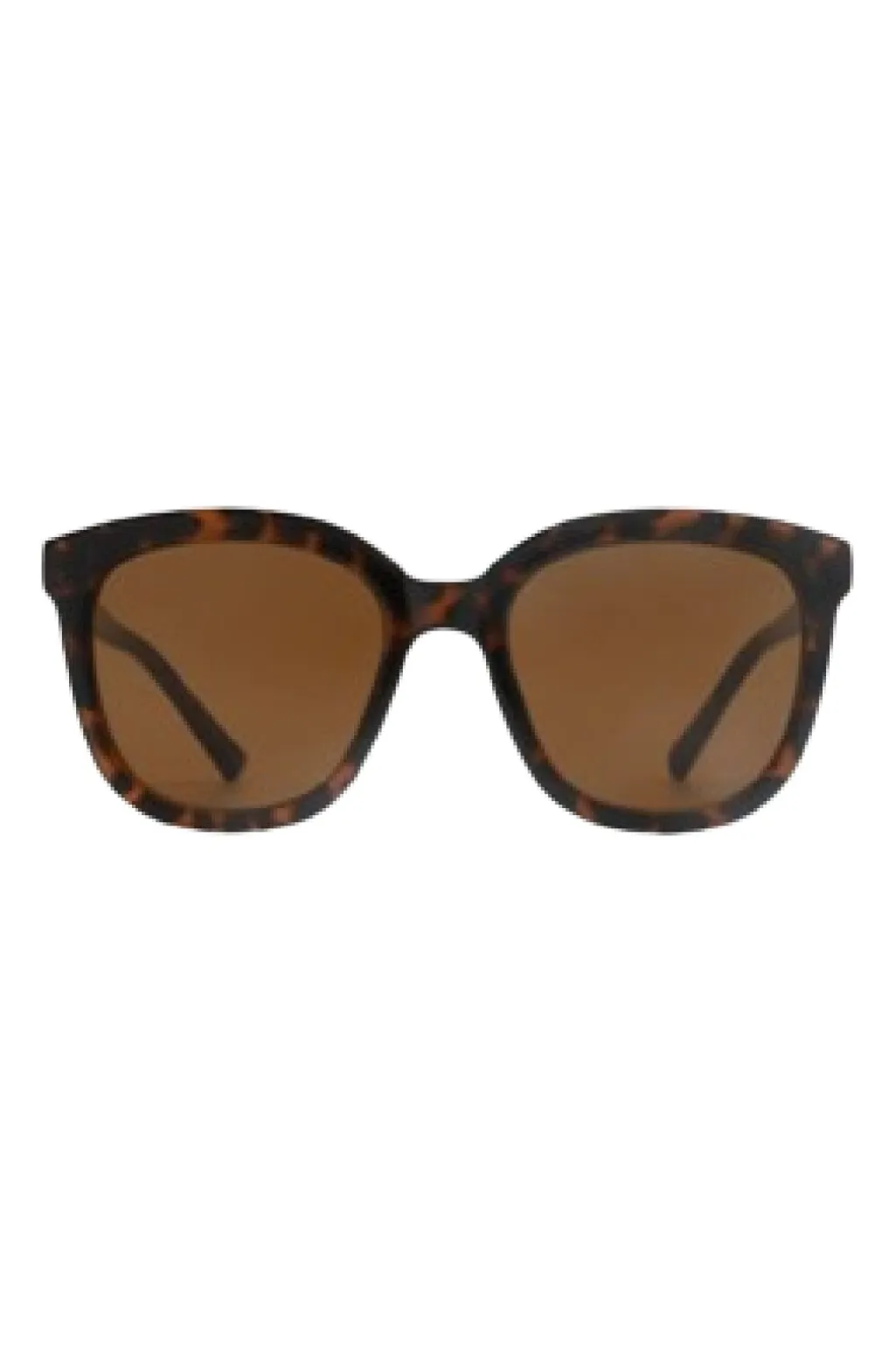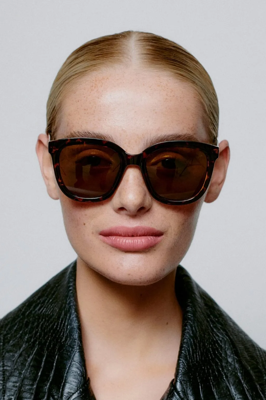 Solbriller fra A. Kjærbede i rektangulær form med brune linser. Stellet har et demi tortoise-mønster og er fremstillet i holdbart polycarbonat med formbare brillestænger.