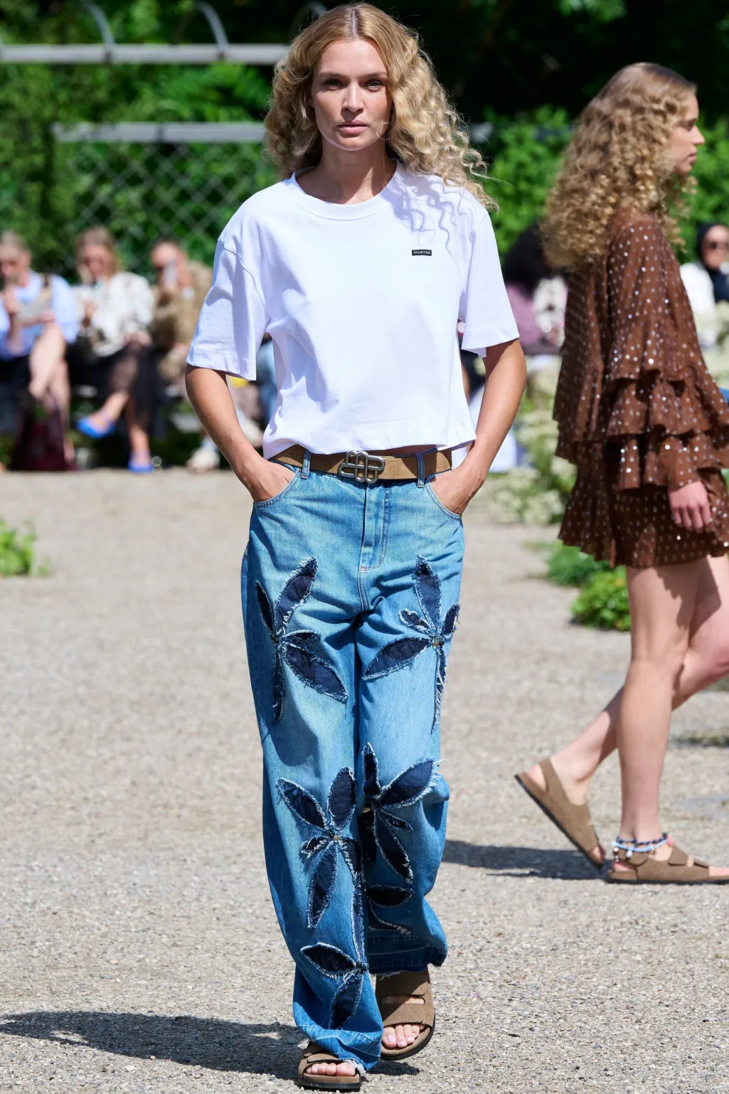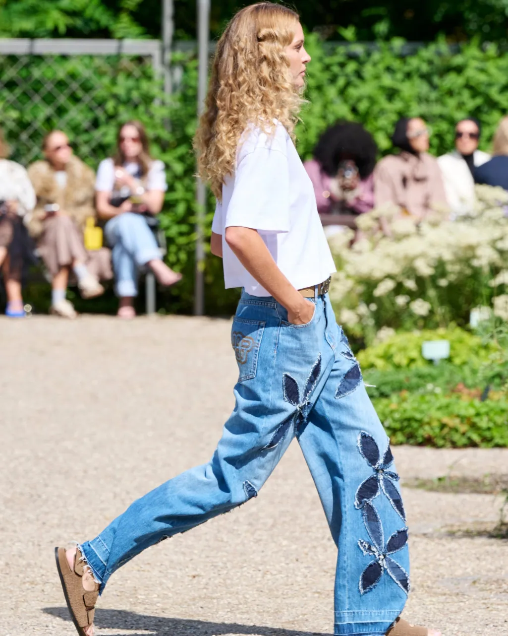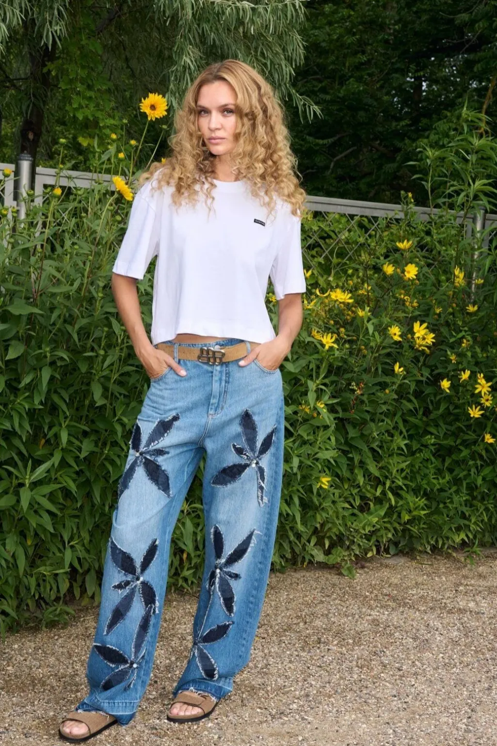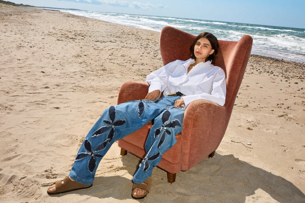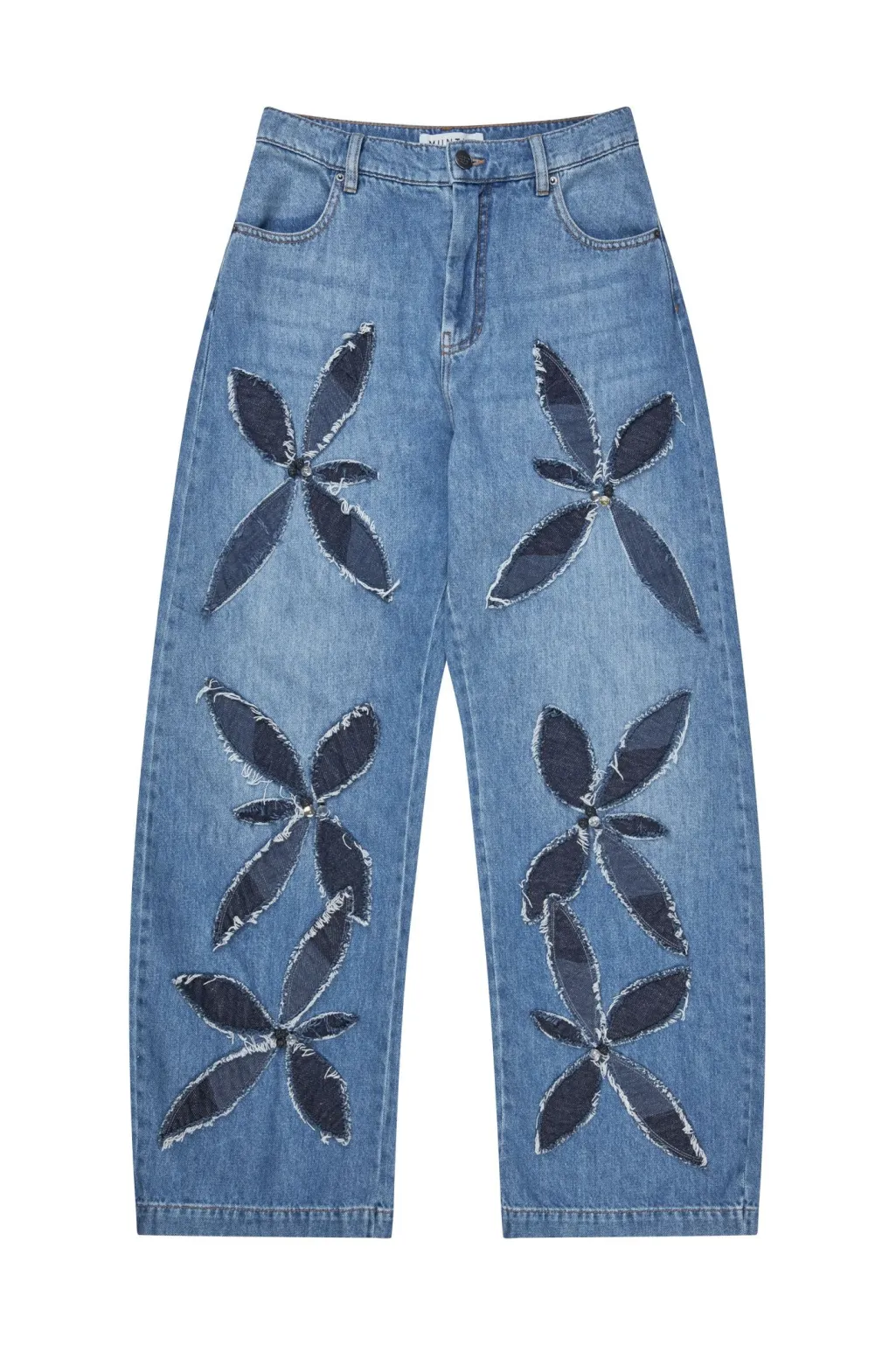 Jeans fra Munthe i blå denim med store, applikerede blomstermotiver på benene. Lavet af 100 % økologisk bomuld med kontrastdenim og dekorative syninger.