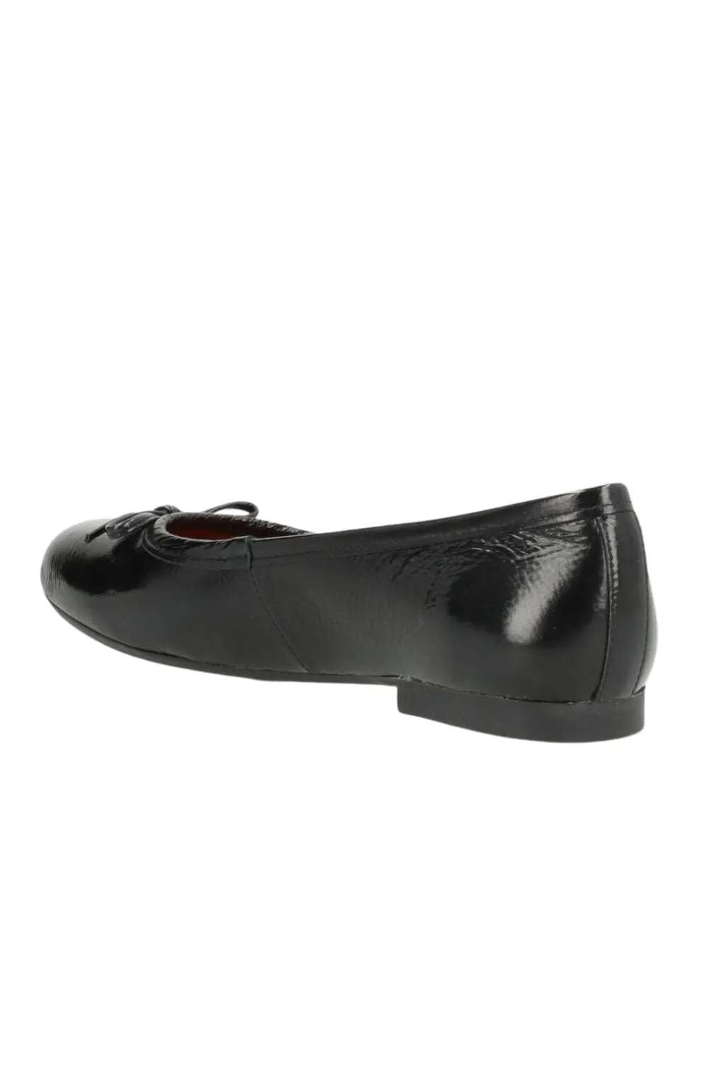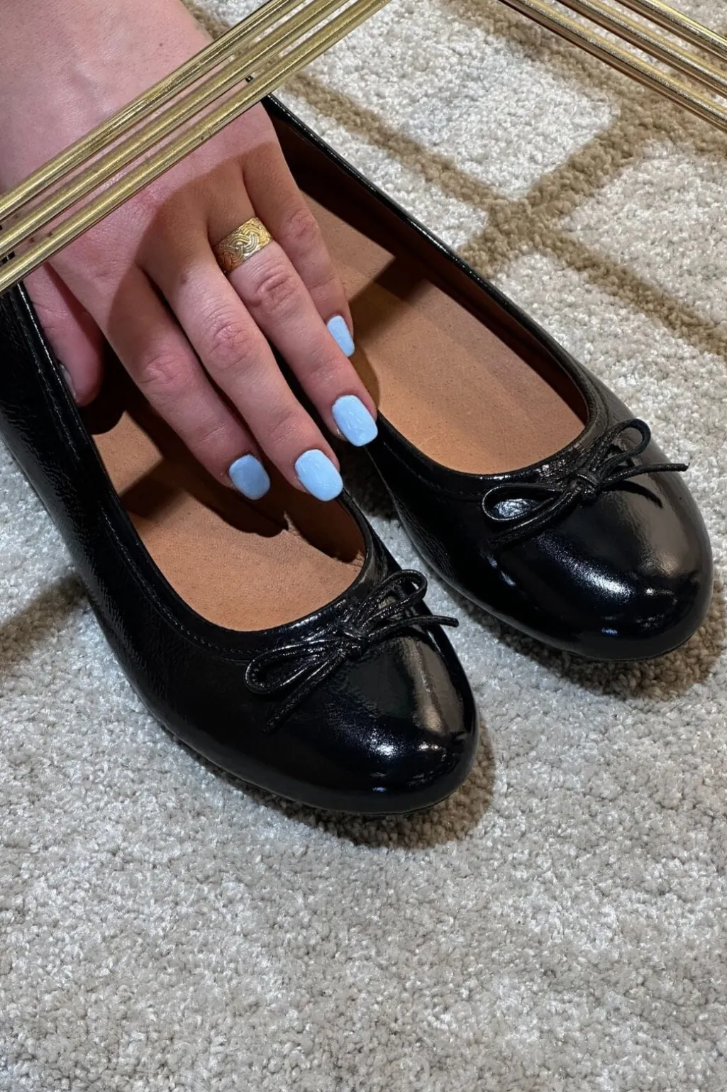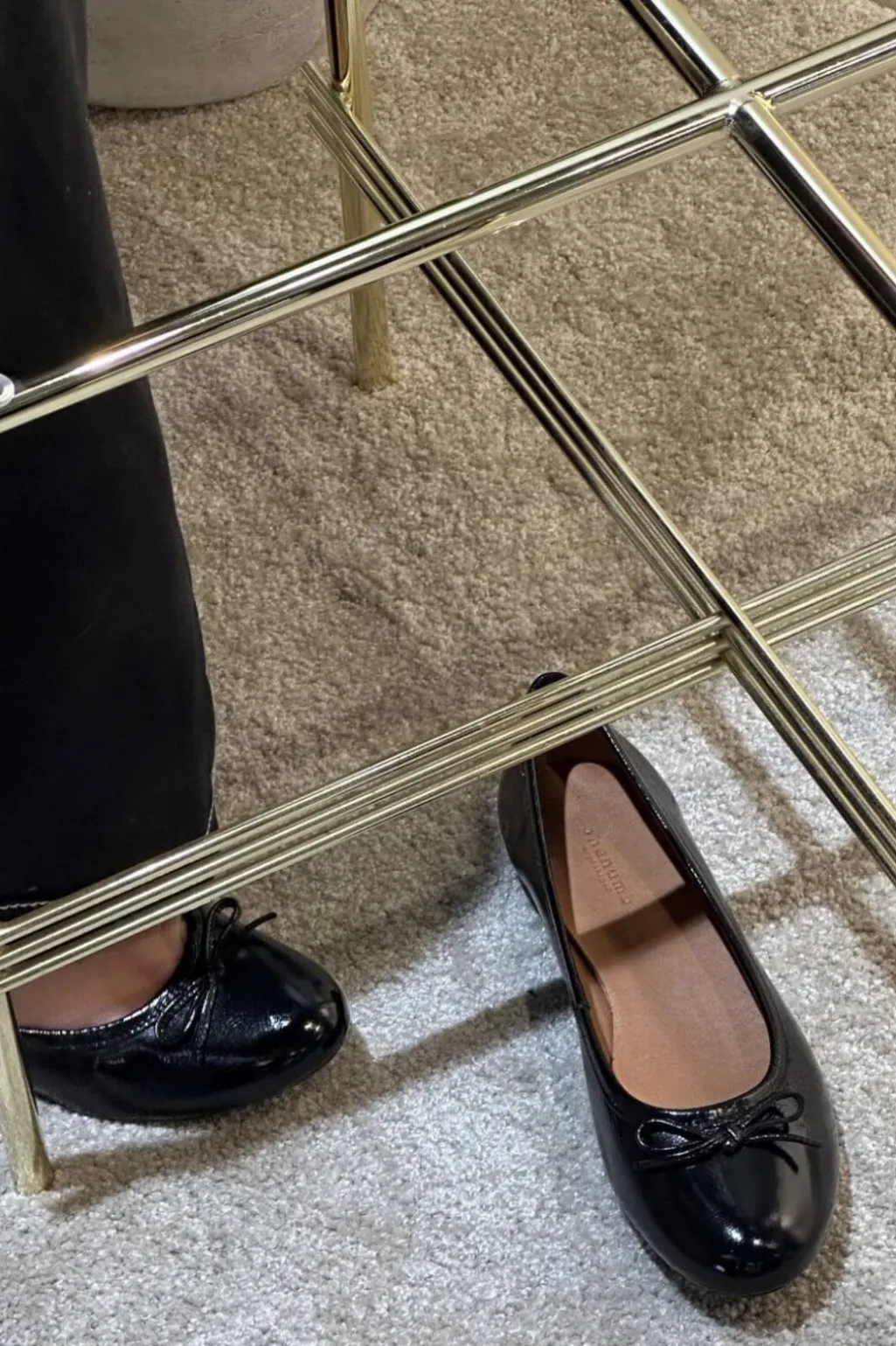 Sort ballerina fra Phenumb Copenhagen med blank overflade og sløjfe foran. Skoen har en rund tå og en flad sål, der gør den praktisk til både hverdag og fest.