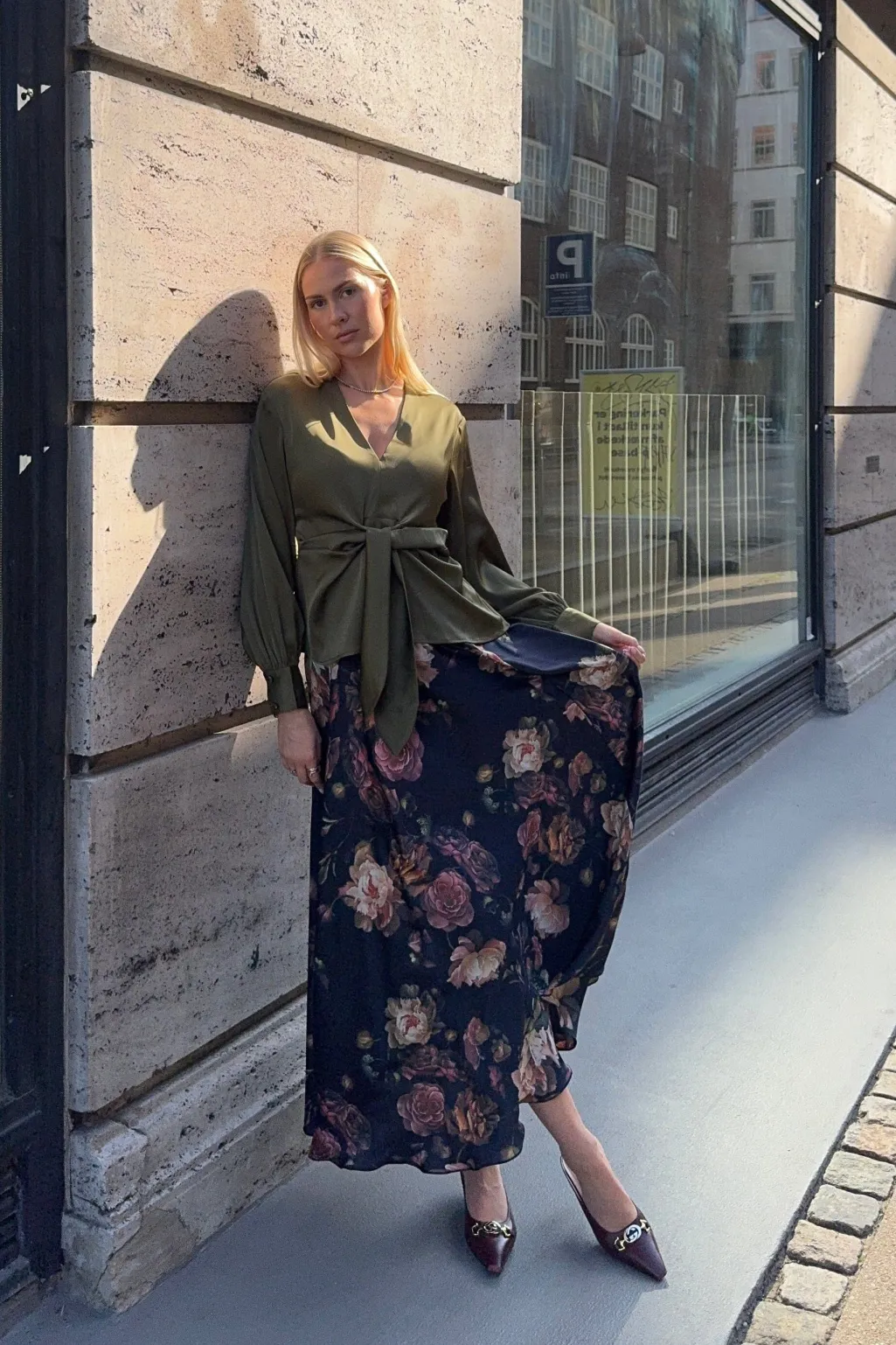 Olivengrøn bluse fra Karmamia med V-hals og knudedetalje foran. Blusen har lange ærmer med pufeffekt ved håndleddene og et blankt, glat stof.