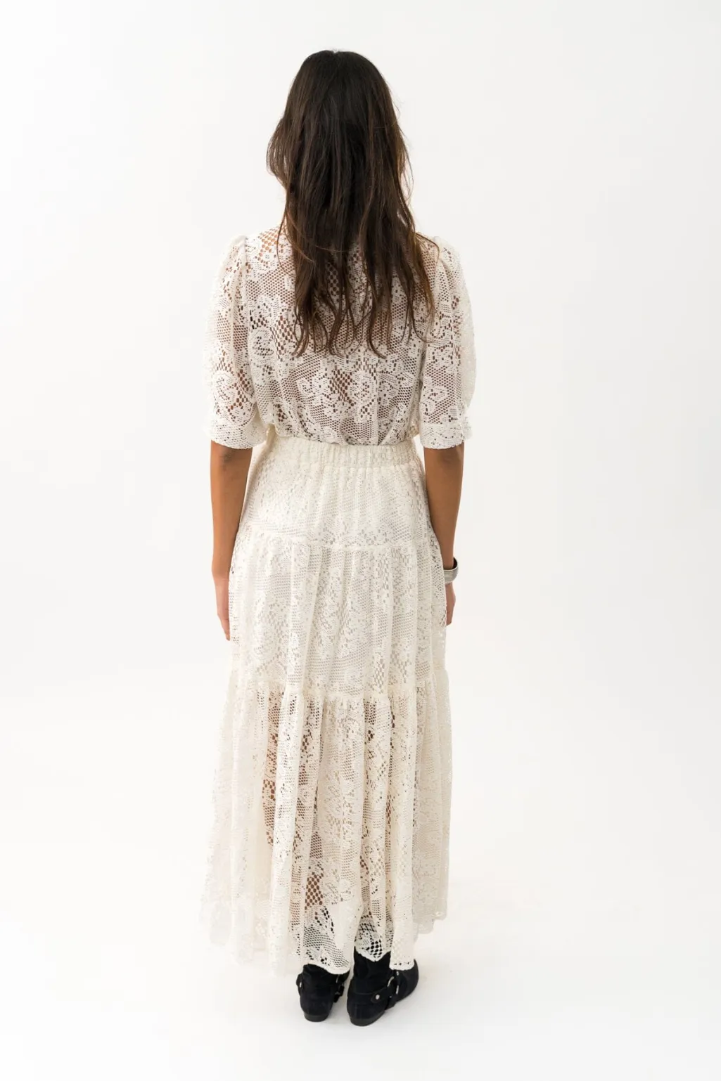 Cremehvid skjorte fra Lollys Laundry med blondedetaljer og blomstermønster. Skjorten har korte, puffede ærmer, klassisk krave og knaplukning foran.