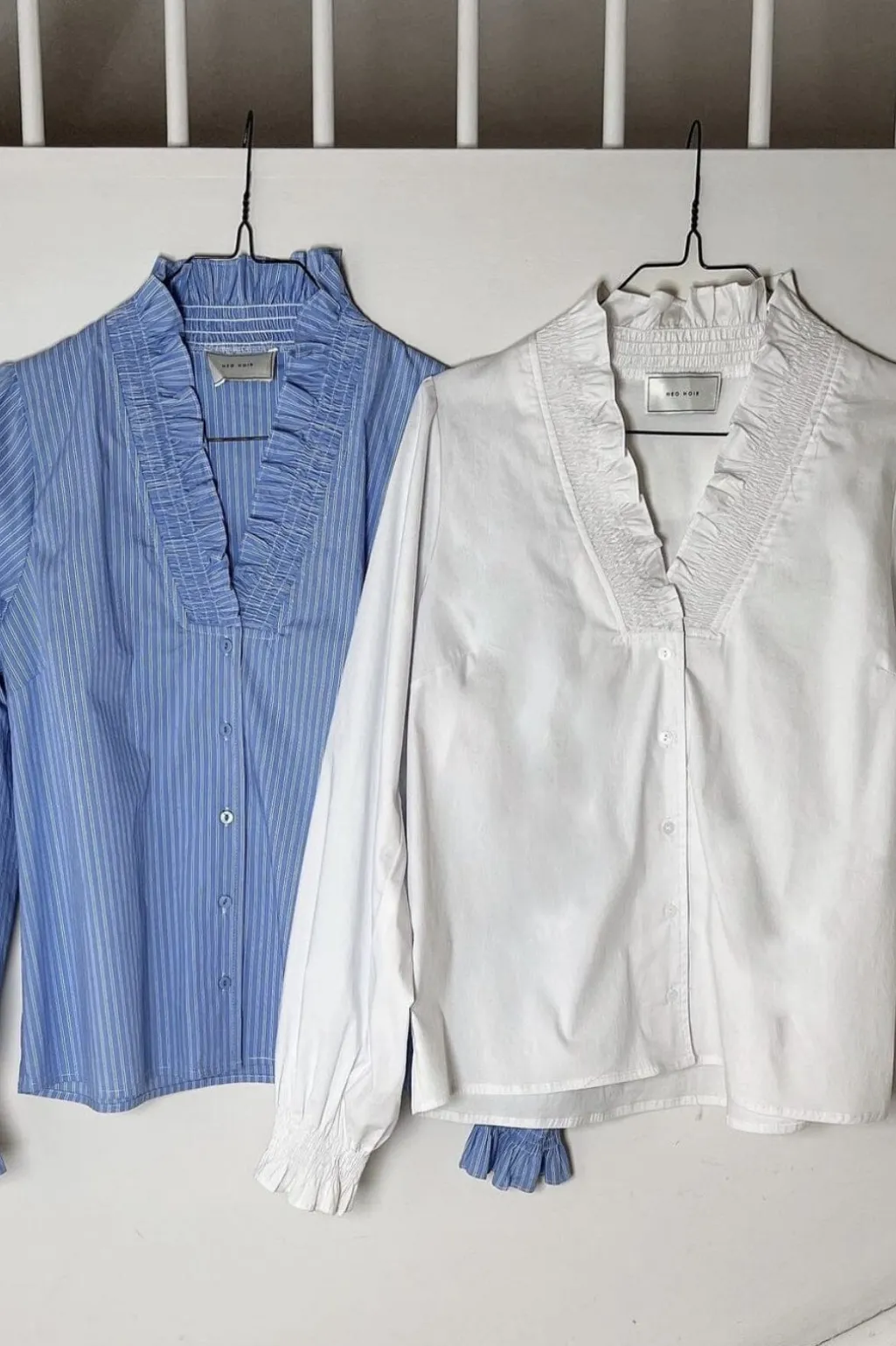 Hvid skjorte fra Neo Noir med flæsekrave og knaplukning foran. Skjorten har puffede ærmer med elastiske manchetter og dekorative syninger, der giver et feminint præg.