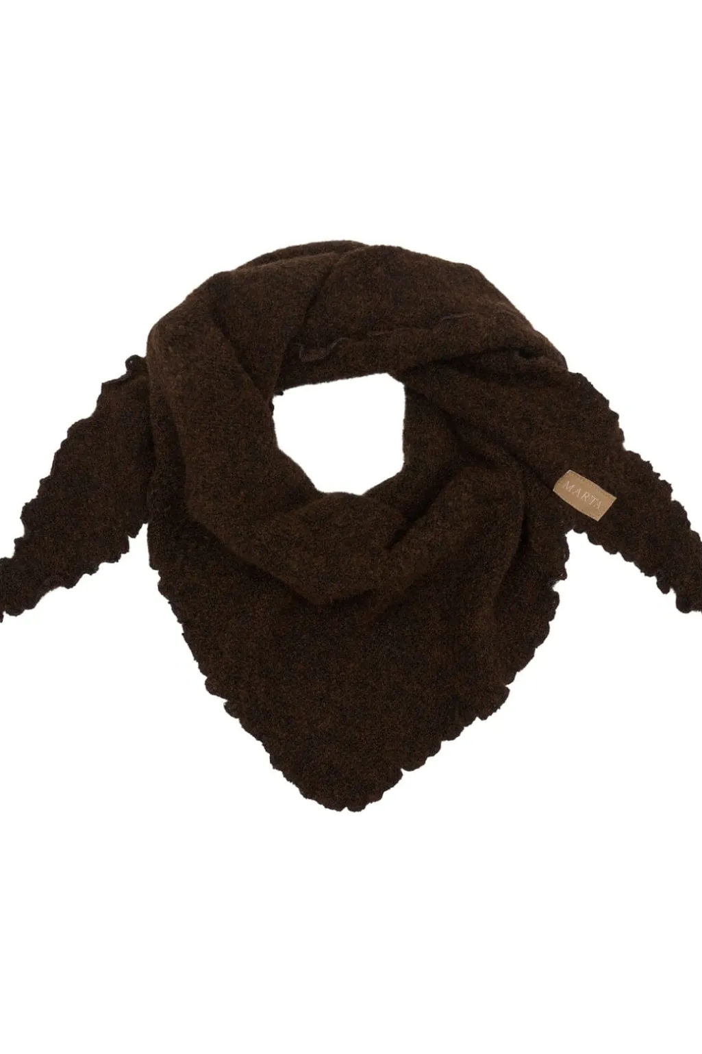 Brunt tørklæde fra Marta Du Chateau med trekantet form og bølget kant. Tørklædet er lavet af superblødt akryl, der giver god varme på kølige dage.