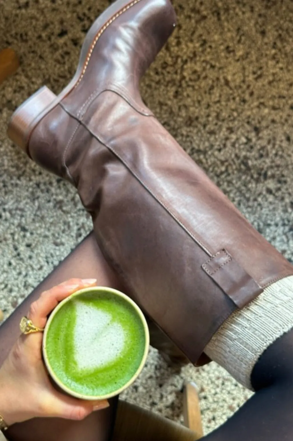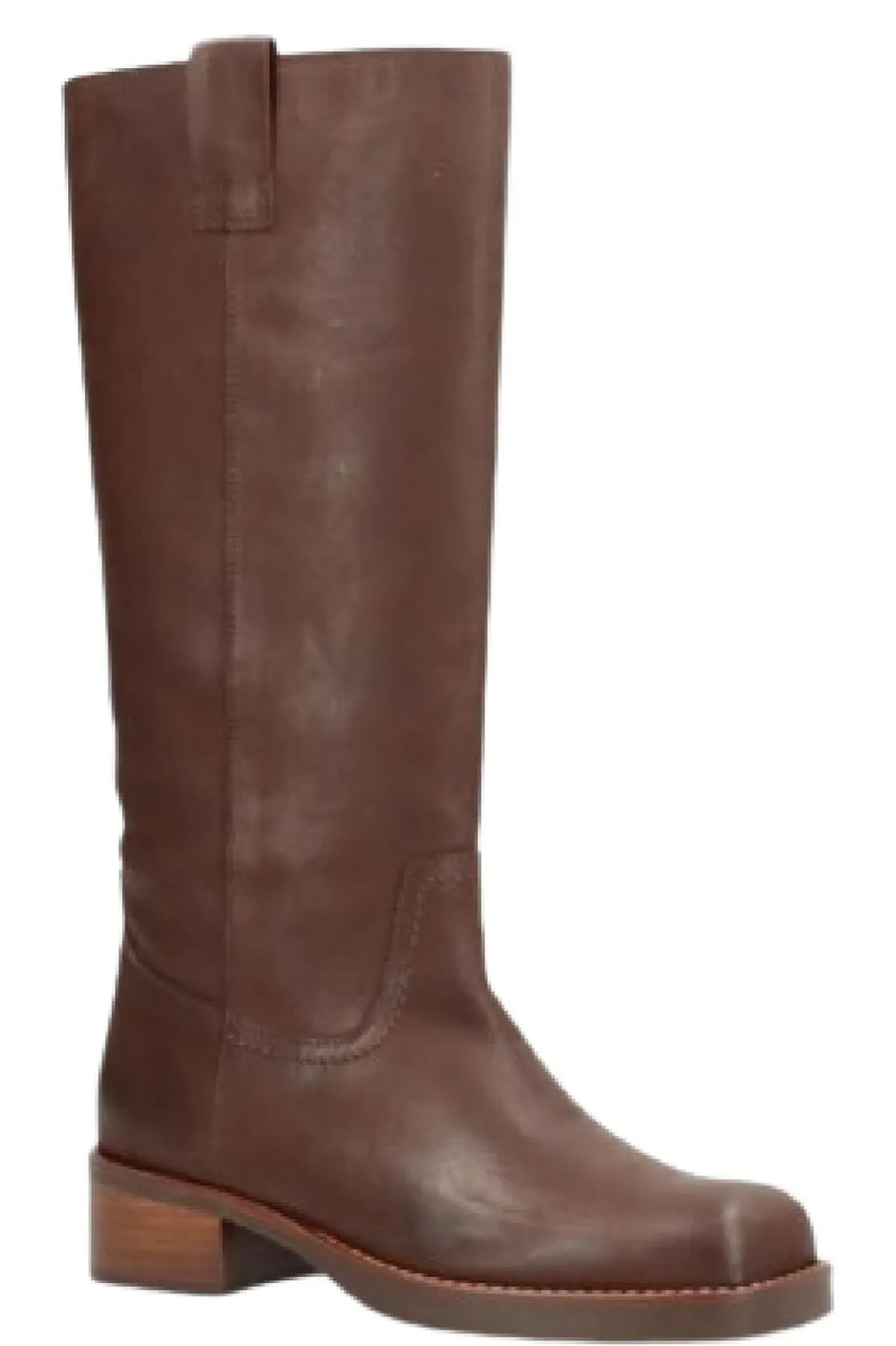Brun læderstøvle med høj skaftlængde og firkantet tå. Støvlen har en blokhæl og er lavet i et enkelt design uden lukning, der gør den nem at tage på.