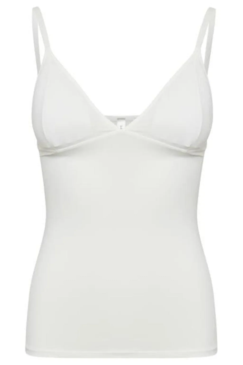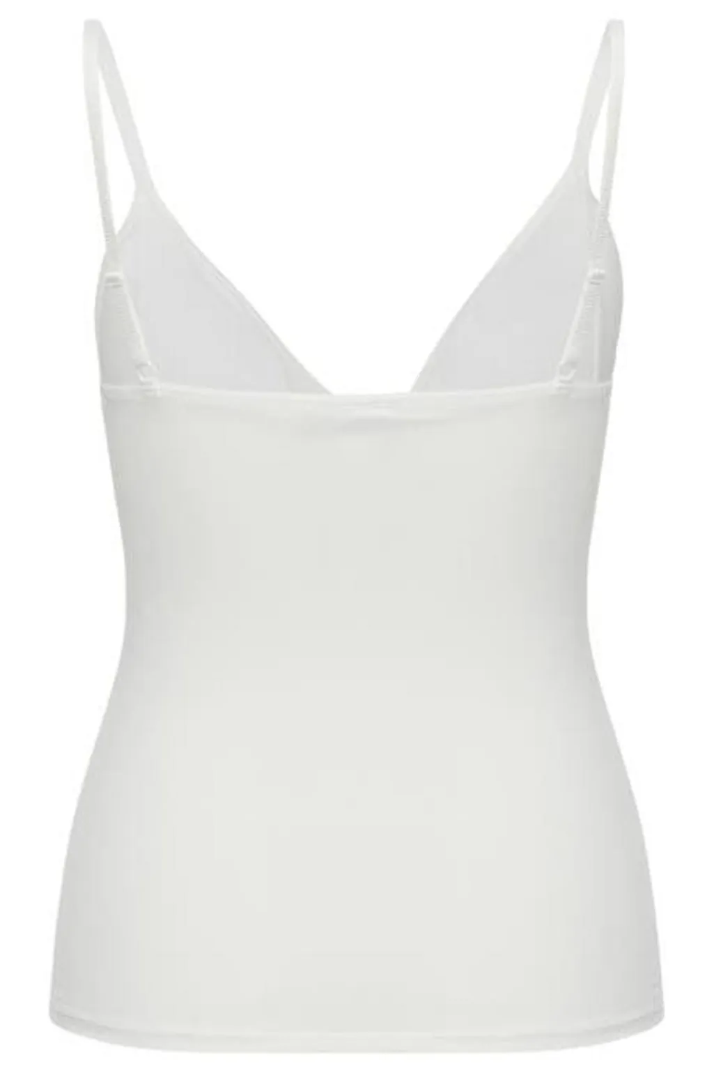 Hvid top fra Gestuz med tynde, justerbare stropper. Toppen har en dyb V-hals og en tætsiddende pasform, der følger kroppens linjer.