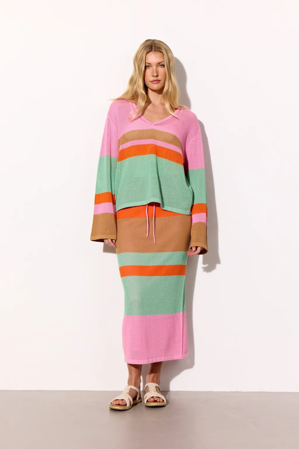 Bluse fra Hunkøn med striber i pink, mintgrøn, orange og brun. Den har en mesh-strikket struktur og en løs pasform.