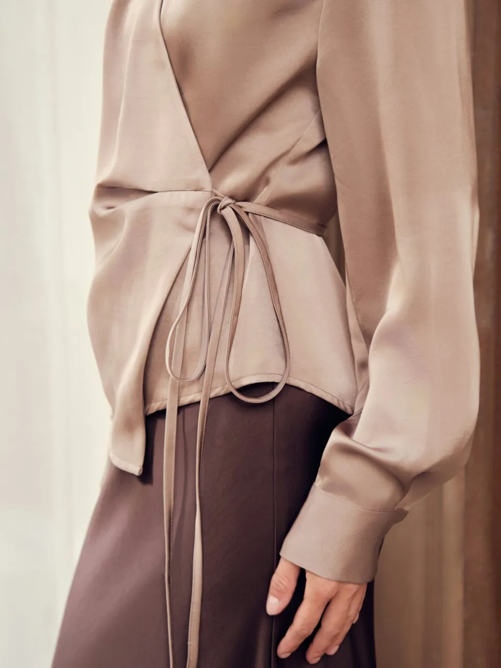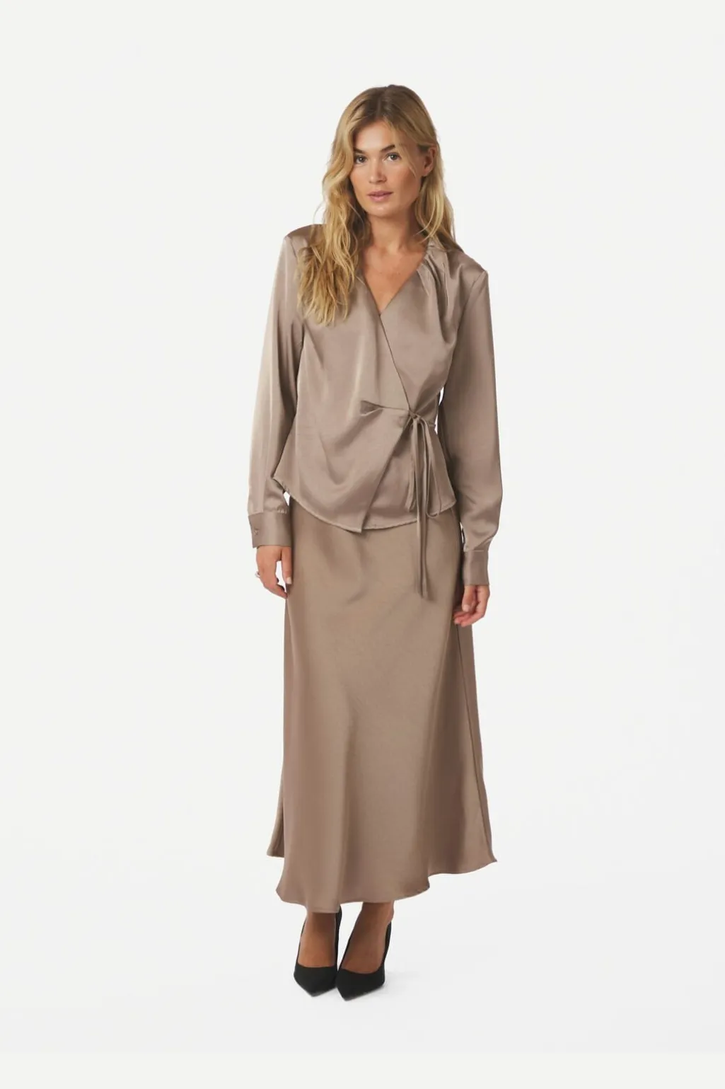 Satinbluse fra Neo Noir i mørk taupe. Blusen har en løs pasform med slå-om-design og bindebånd i siden.
