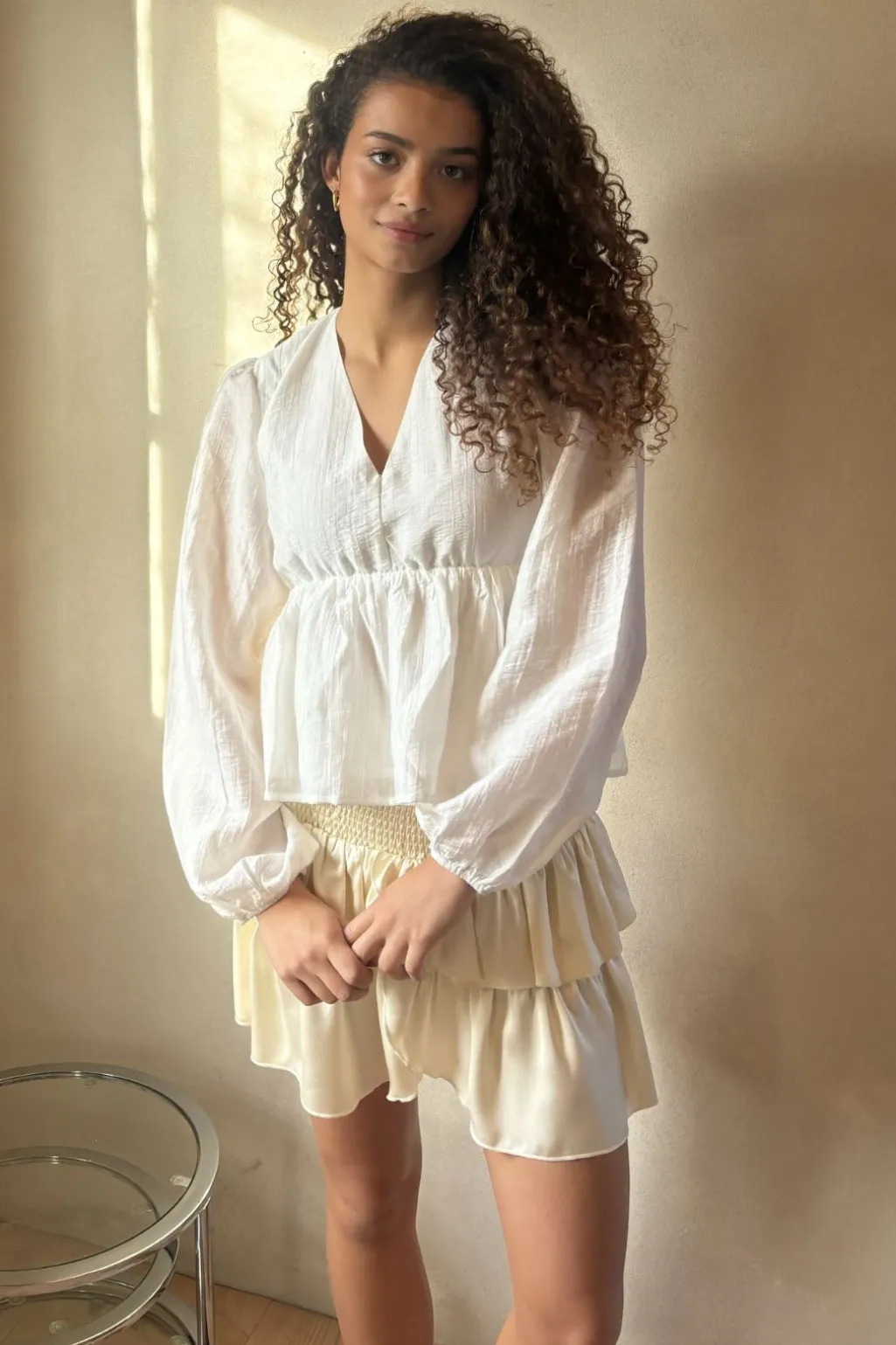 Kort nederdel fra Neo Noir i perlefarvet sateen. Nederdelen har smock-elastik i taljen og to lag flæser, der giver bevægelse til designet.