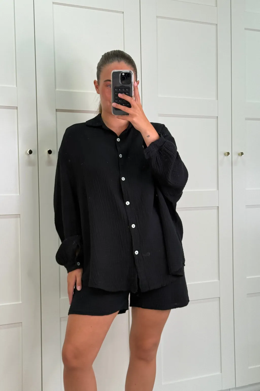 Sort sæt fra A-bee i to dele med skjorte og shorts. Fremstillet i ren bomuld med knapper foran på skjorten og snøre i shortsene. Sættet har en afslappet pasform.