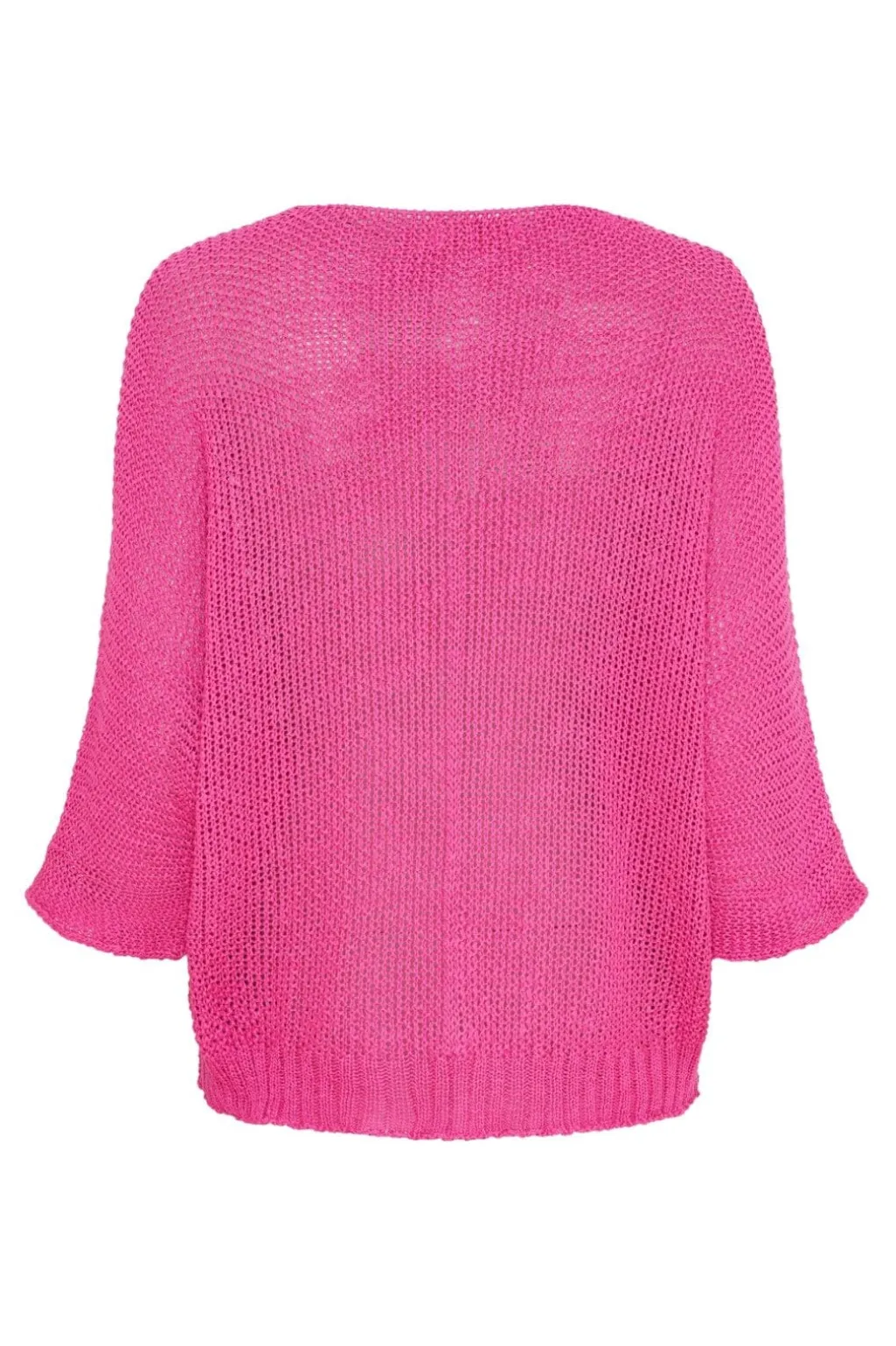Pink strikbluse fra Marta Du Chateau med løs pasform og v-hals. Blusen har 3/4 ærmer og er strikket i en lys pink farve, der passer til både forår og sommer.