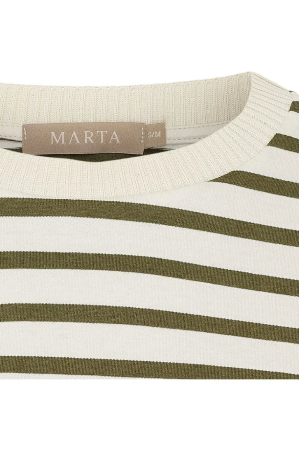 Stribet t-shirt fra Marta Du Chateau med beige og militærgrønne striber. T-shirten har en løs pasform med 3/4-ærmer og rund hals.