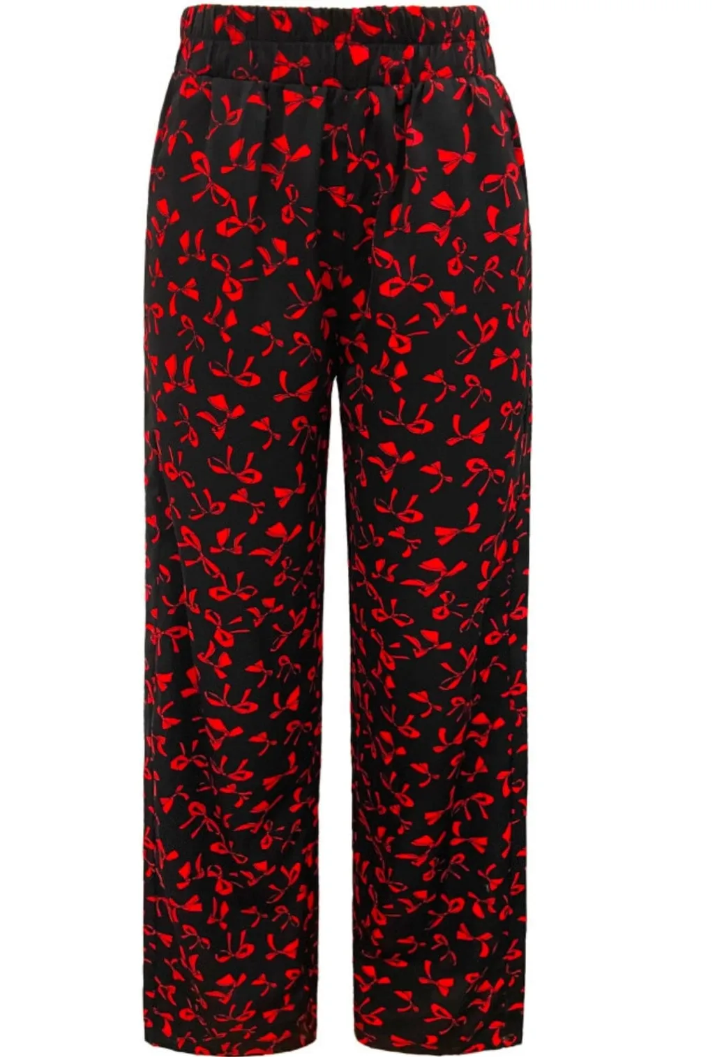 Sorte bukser fra Liberte med røde sløjfer. De har et festligt sløjfeprint i sort og rødt, som giver bukserne et særpræget udtryk. Bukserne er i ankellængde med elastisk talje.