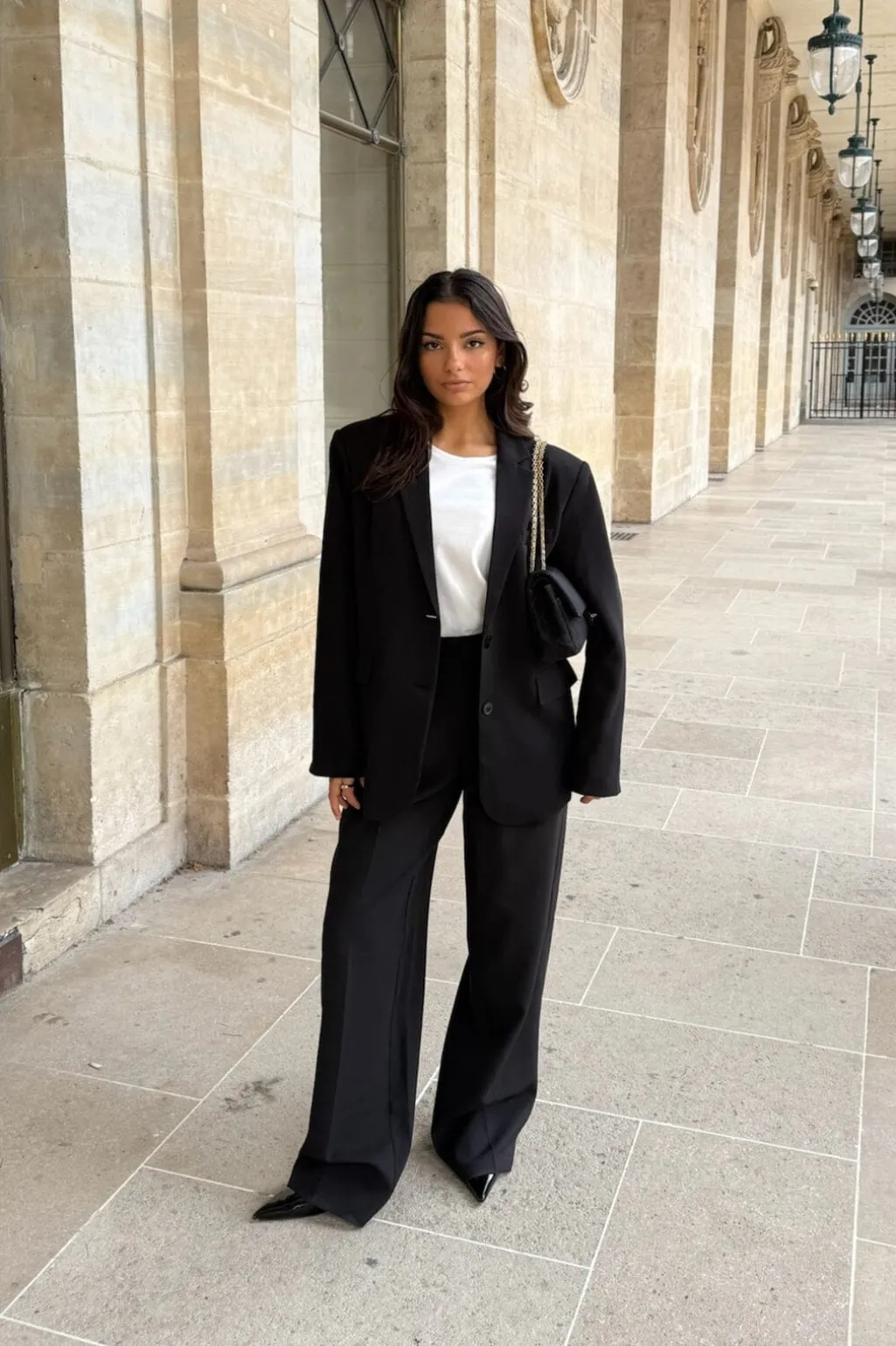 Sorte bukser fra BYIC med høj talje og brede ben. Bukserne har en løs pasform og går helt ned til gulvet, hvilket gør dem velegnede til både hverdag og fest.