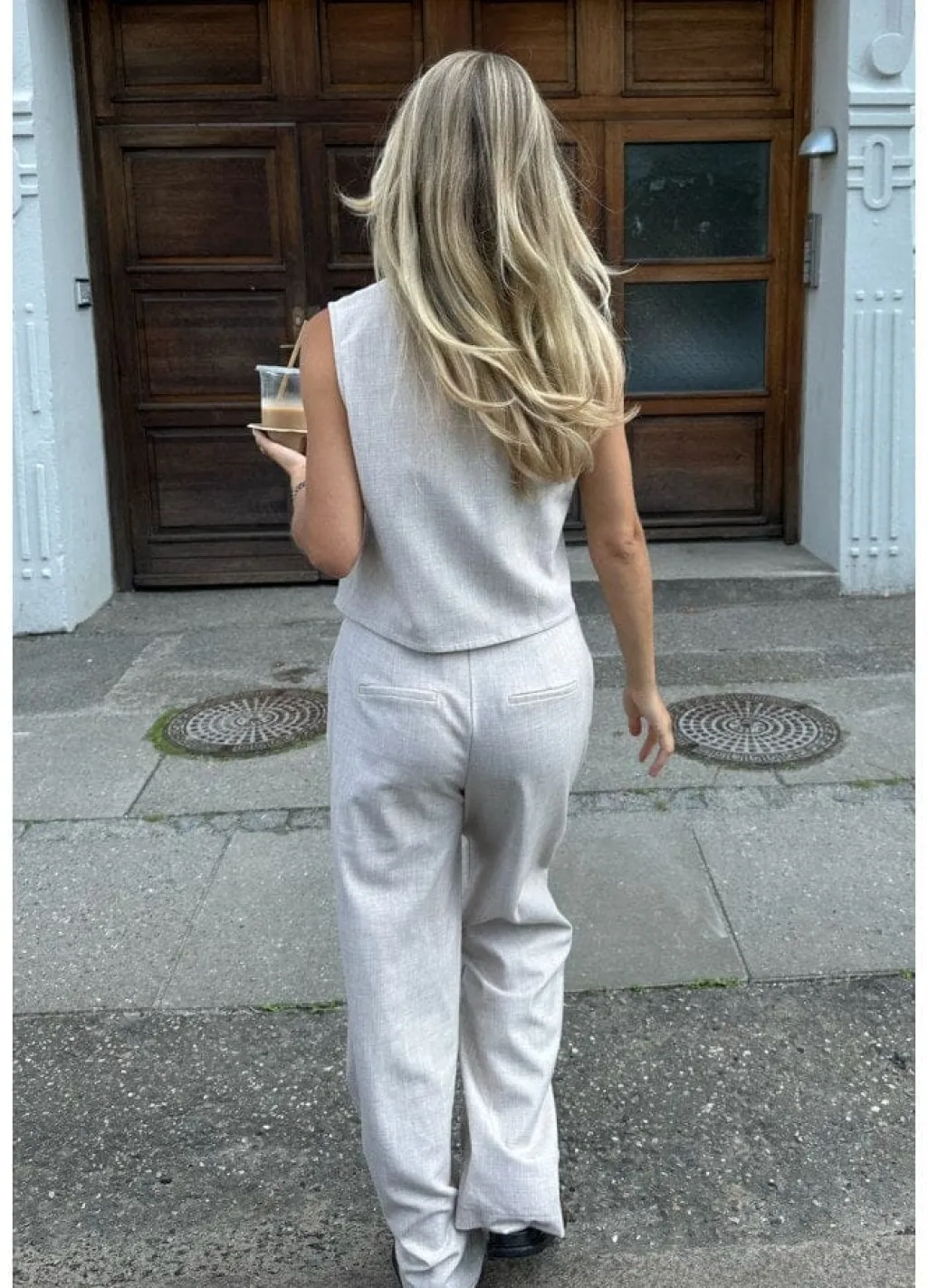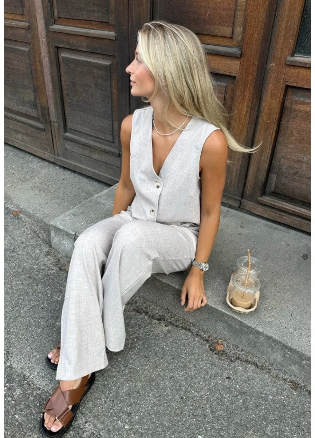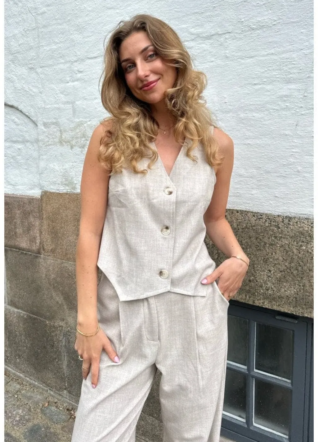 Beige vest fra BYIC med tre knapper foran og V-halsudskæring. Den ærmeløse model matcher Celina-bukserne og har en regular fit-pasform.