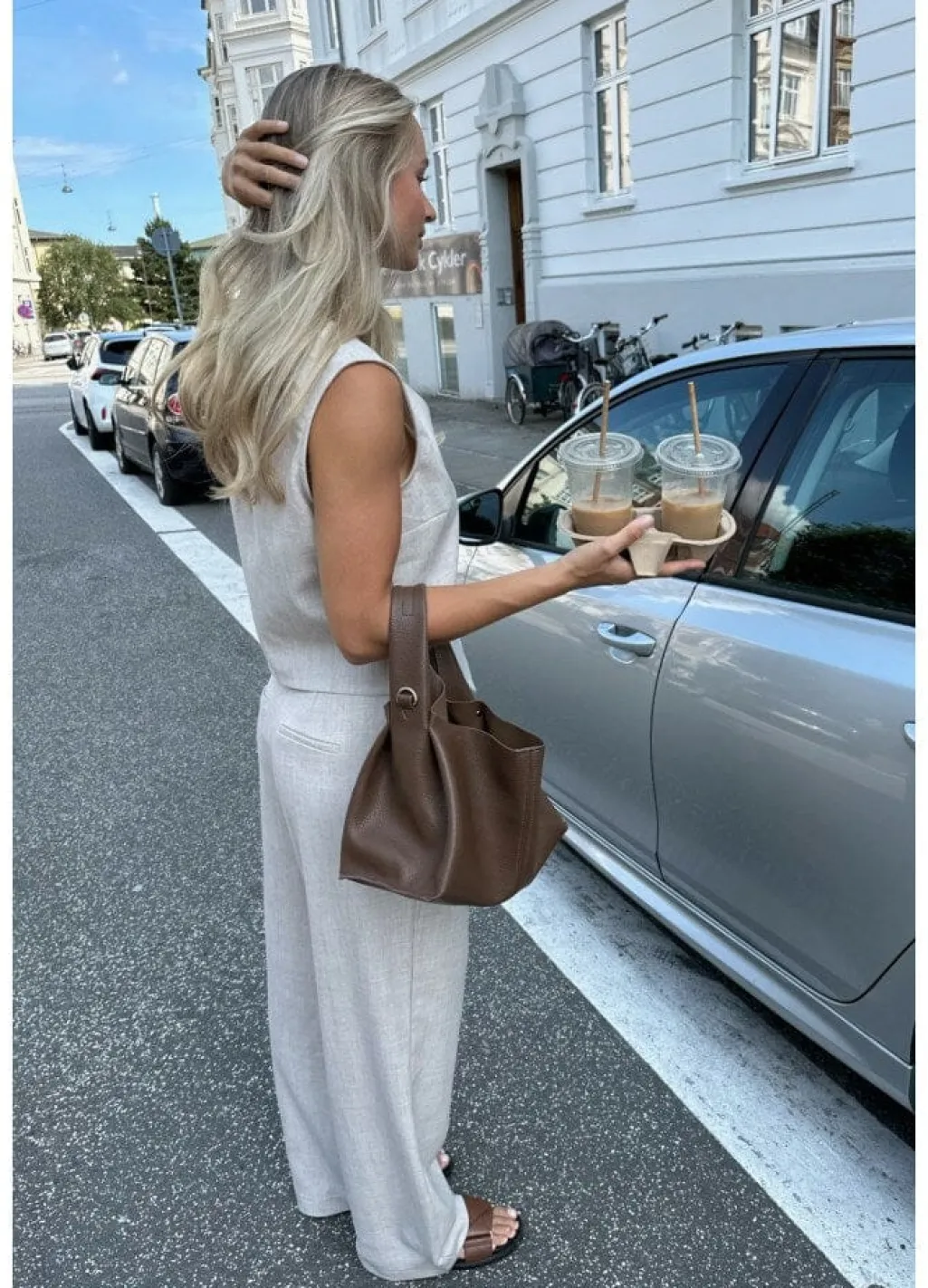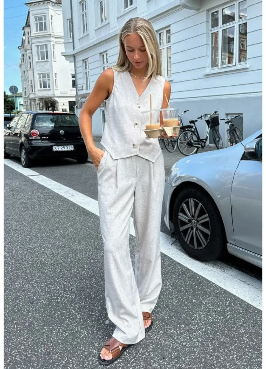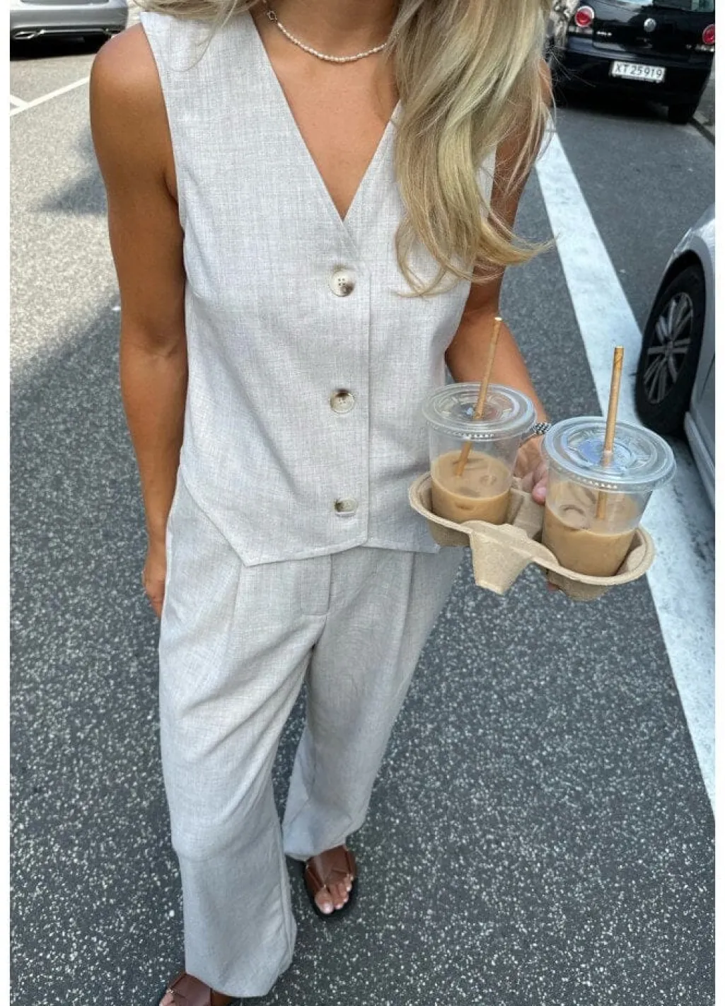 Beige vest fra BYIC med tre knapper foran og V-halsudskæring. Den ærmeløse model matcher Celina-bukserne og har en regular fit-pasform.