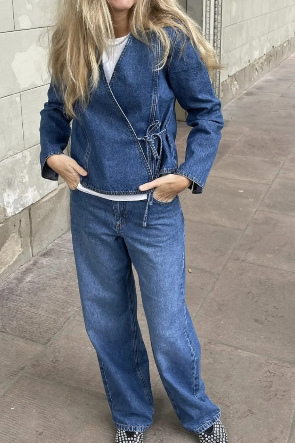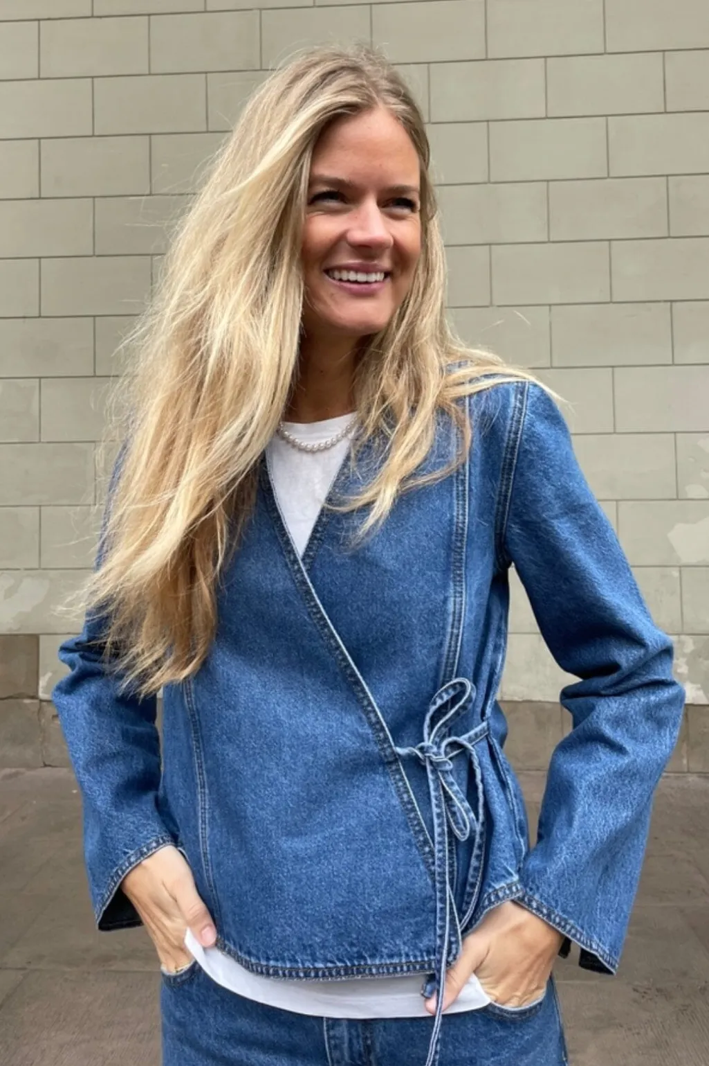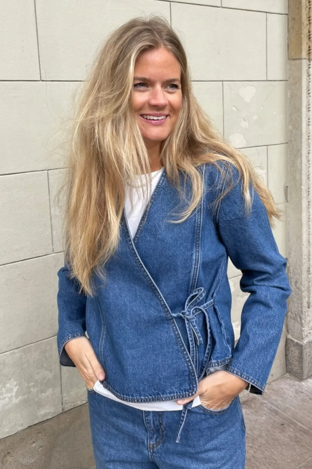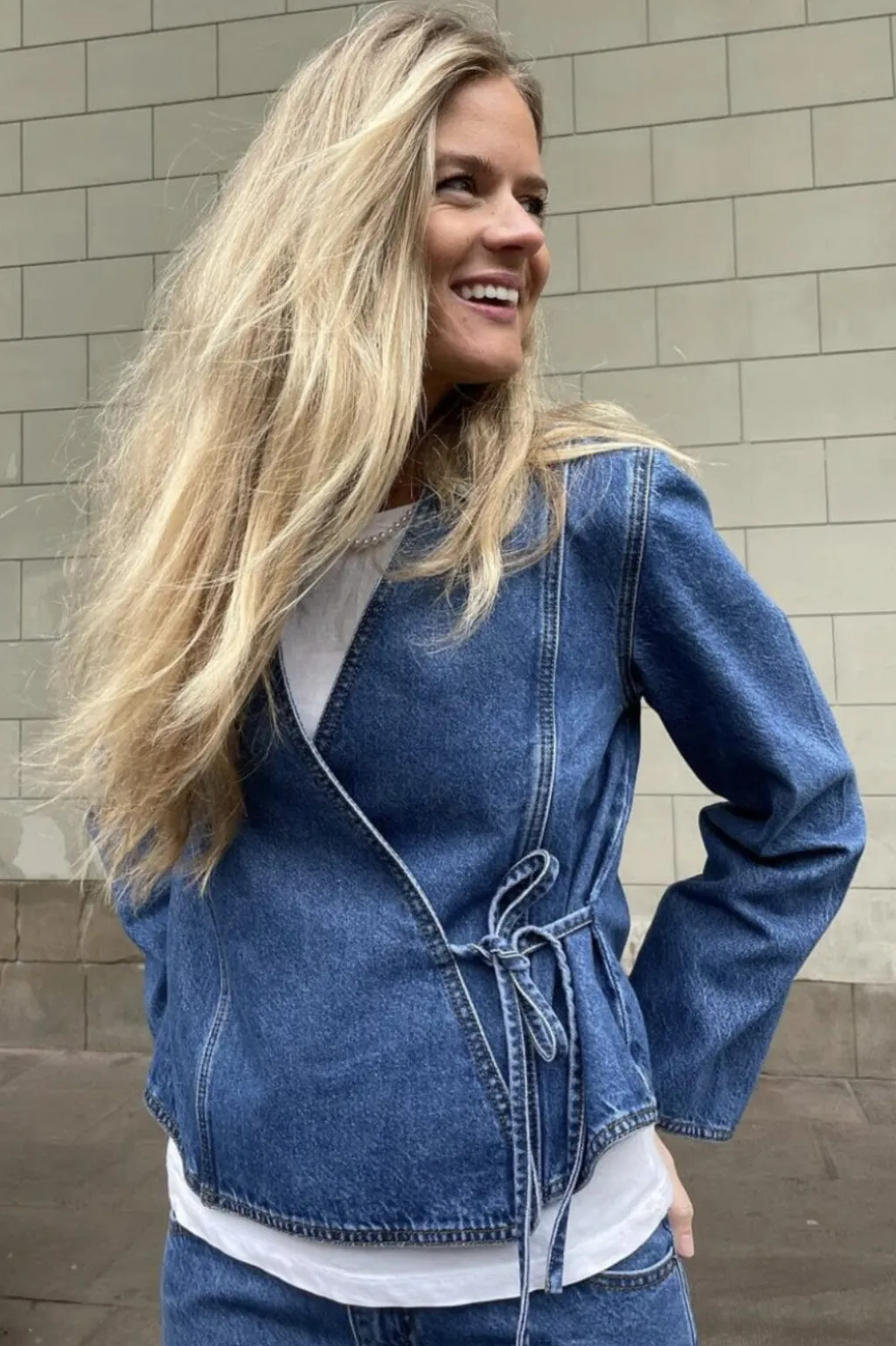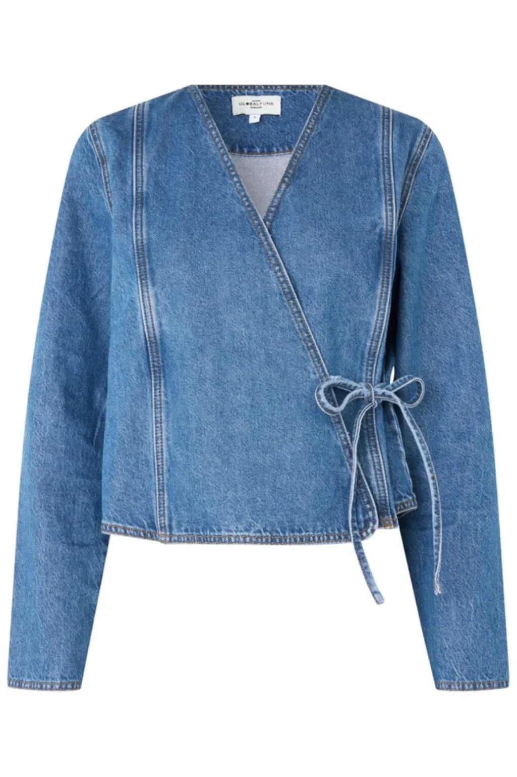 Denimjakke fra Global Funk i en vintage blå vask. Jakken har et wrap-design med bindebånd i taljen og en V-halsudskæring. De dekorative syninger giver jakken et rustikt præg.