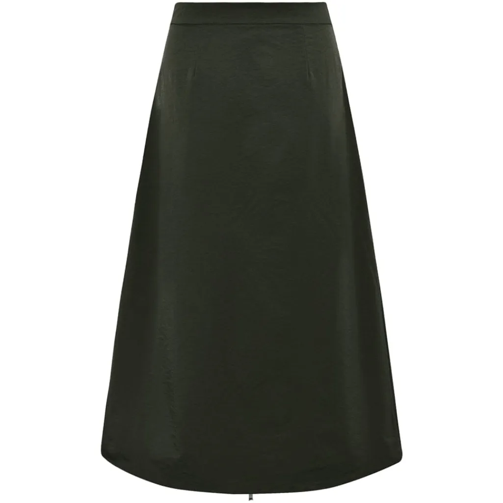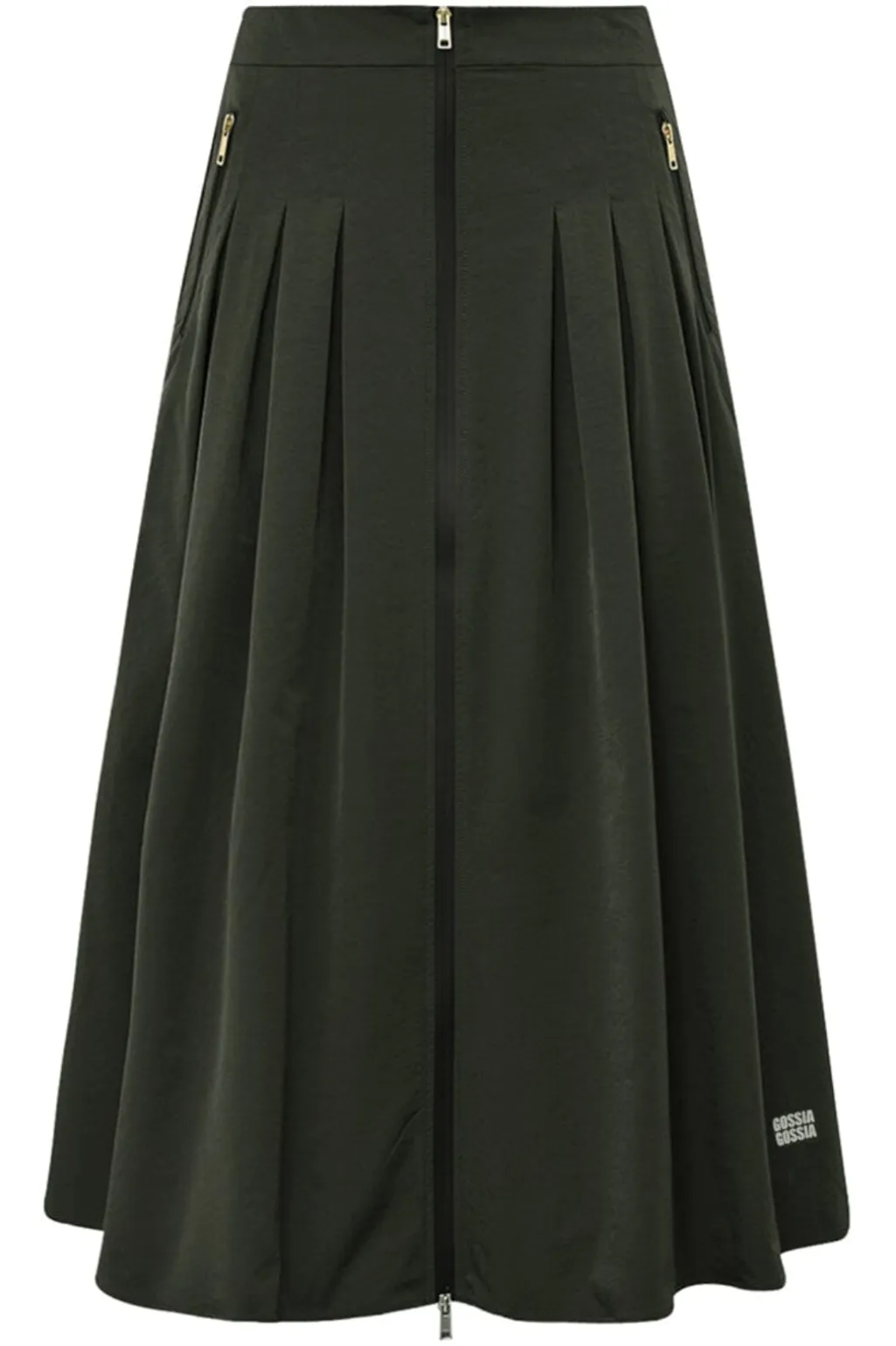 Nederdel fra Gossia i en mørk armygrøn nuance. Den ensfarvede nederdel har en lang længde og lynlåsdetaljer både foran og ved lommerne.