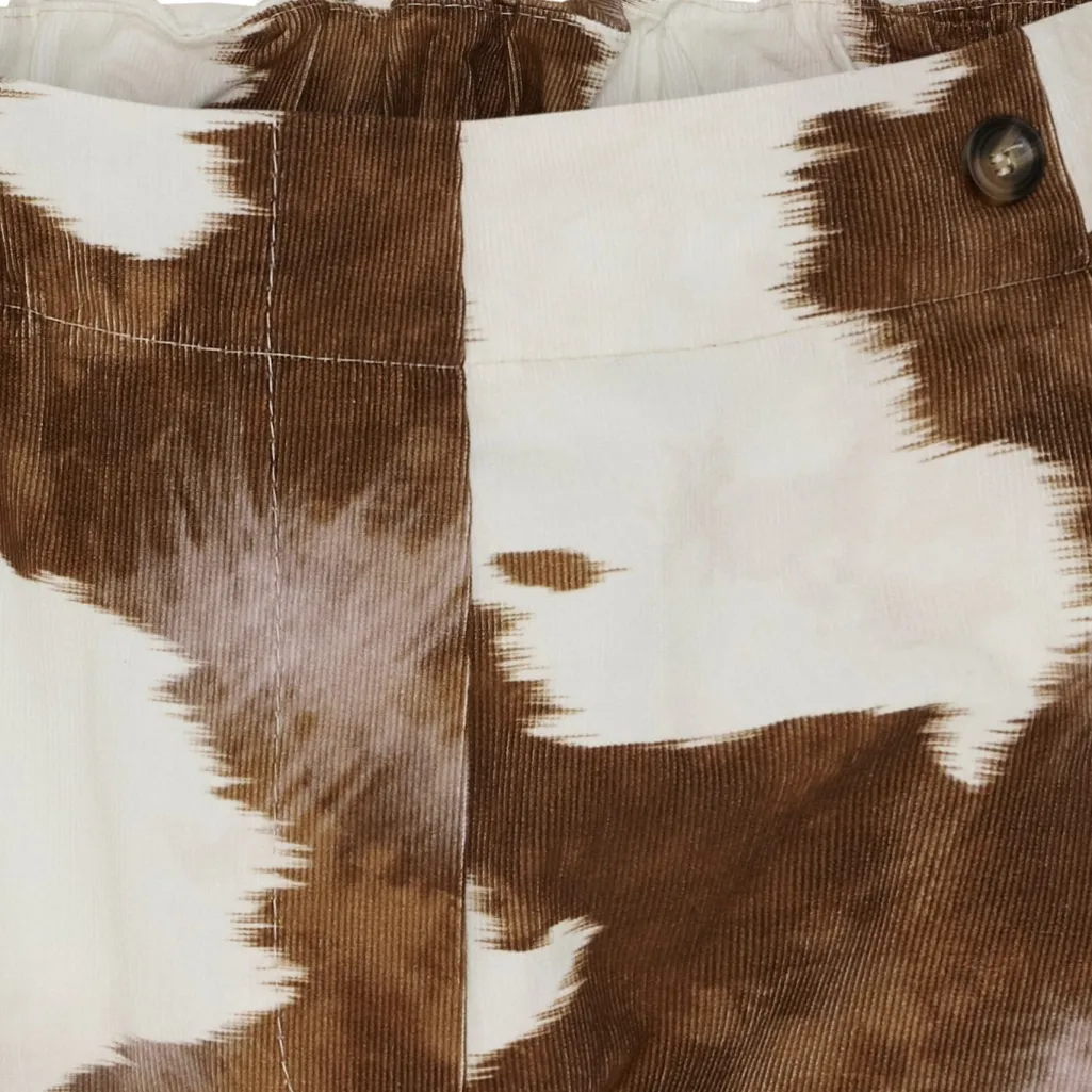 Bukser fra Marta Du Chateau med brunt og hvidt cow print. Bukserne har en normal pasform og går til anklen. Lukningen består af både elastik og knapper i taljen.