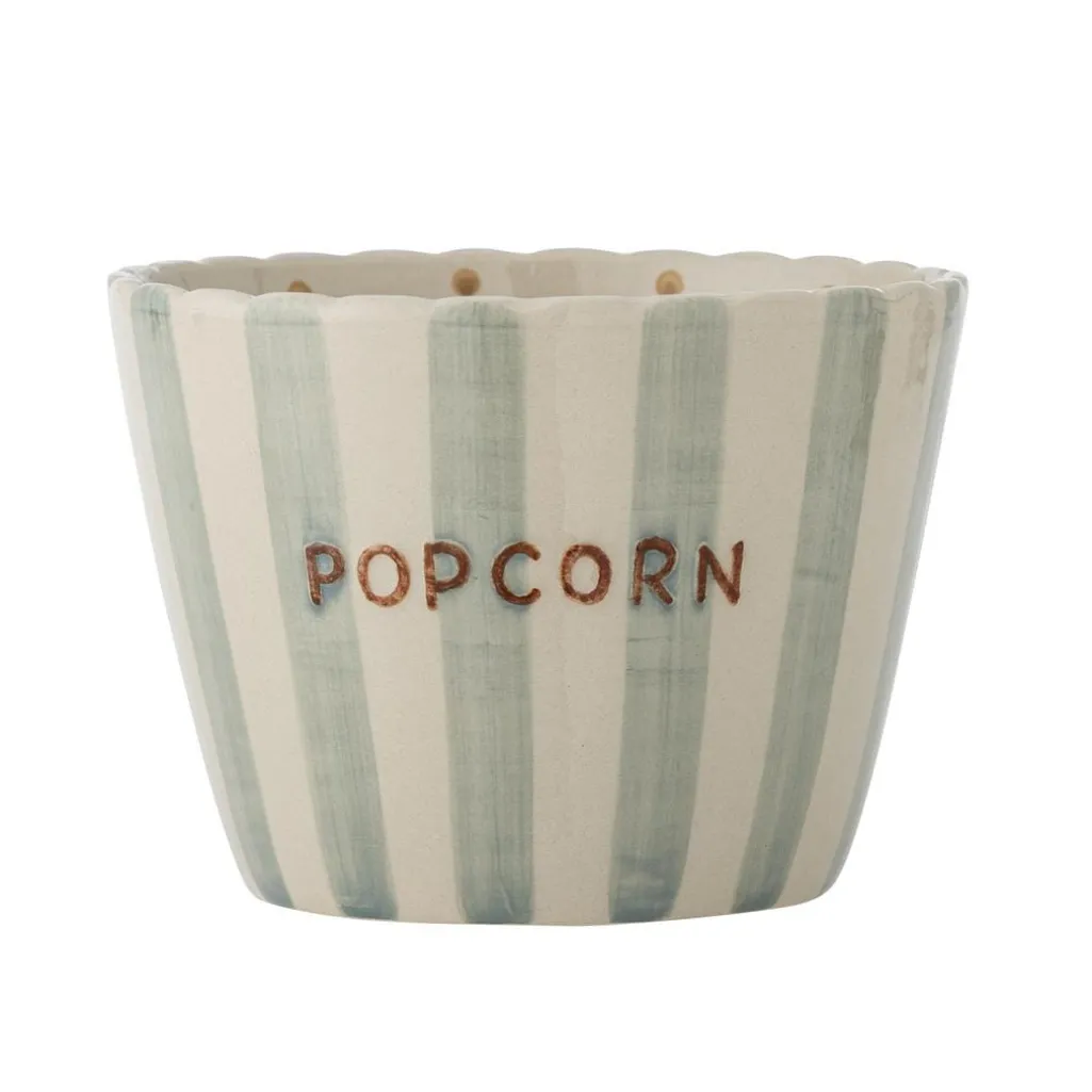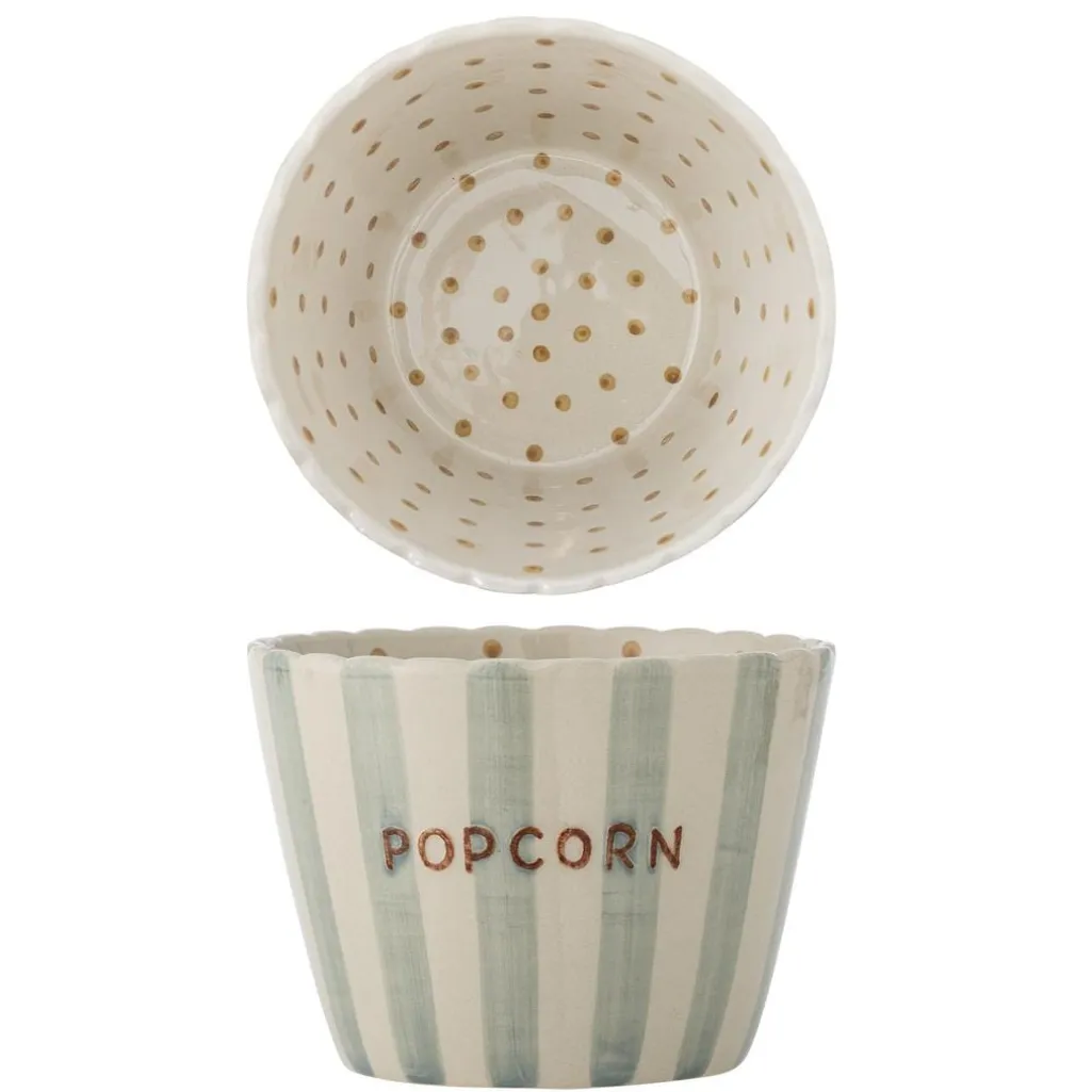 Skål fra Bloomingville, fremstillet af stentøj med håndmalede striber og teksten POPCORN. Kanten er bølget, og indersiden har beige prikker. Små variationer i mønsteret kan forekomme.