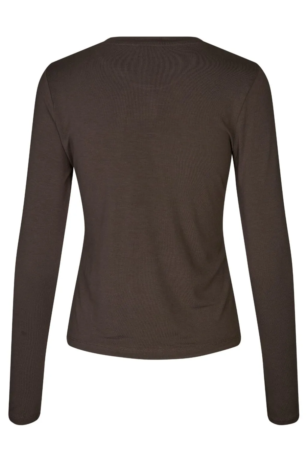 Langærmet T-shirt fra MbyM i brun farve. Toppen har en tætsiddende pasform og rund halsudskæring.