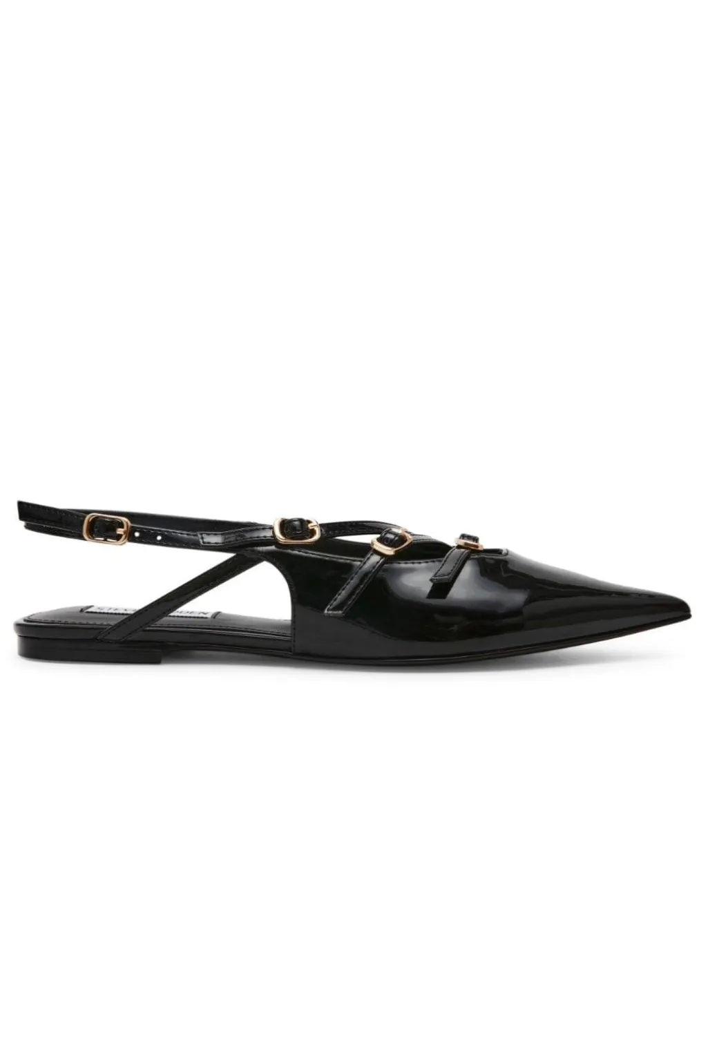 Sort sandal fra Steve Madden med lakfinish. Skoen har en spids tå og tre tynde remme med gyldne spænder, der krydser hen over foden.