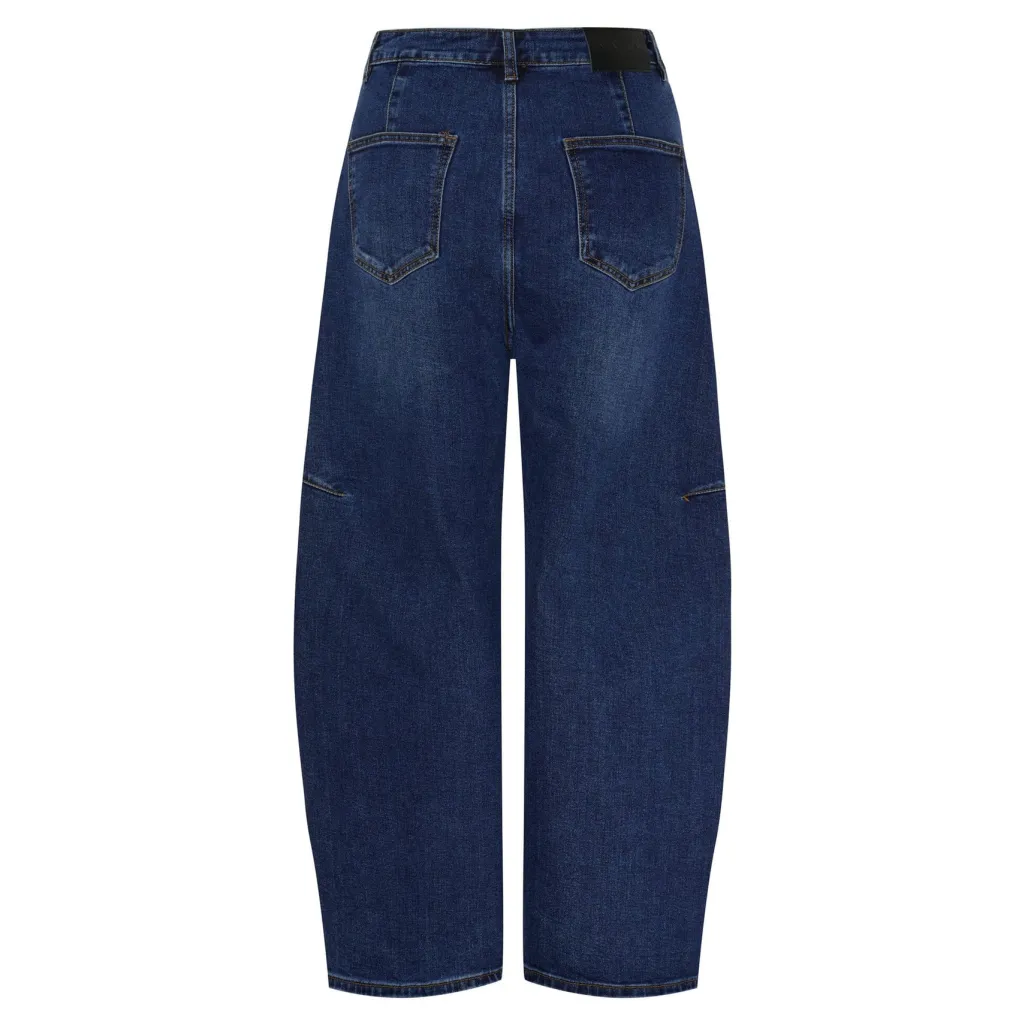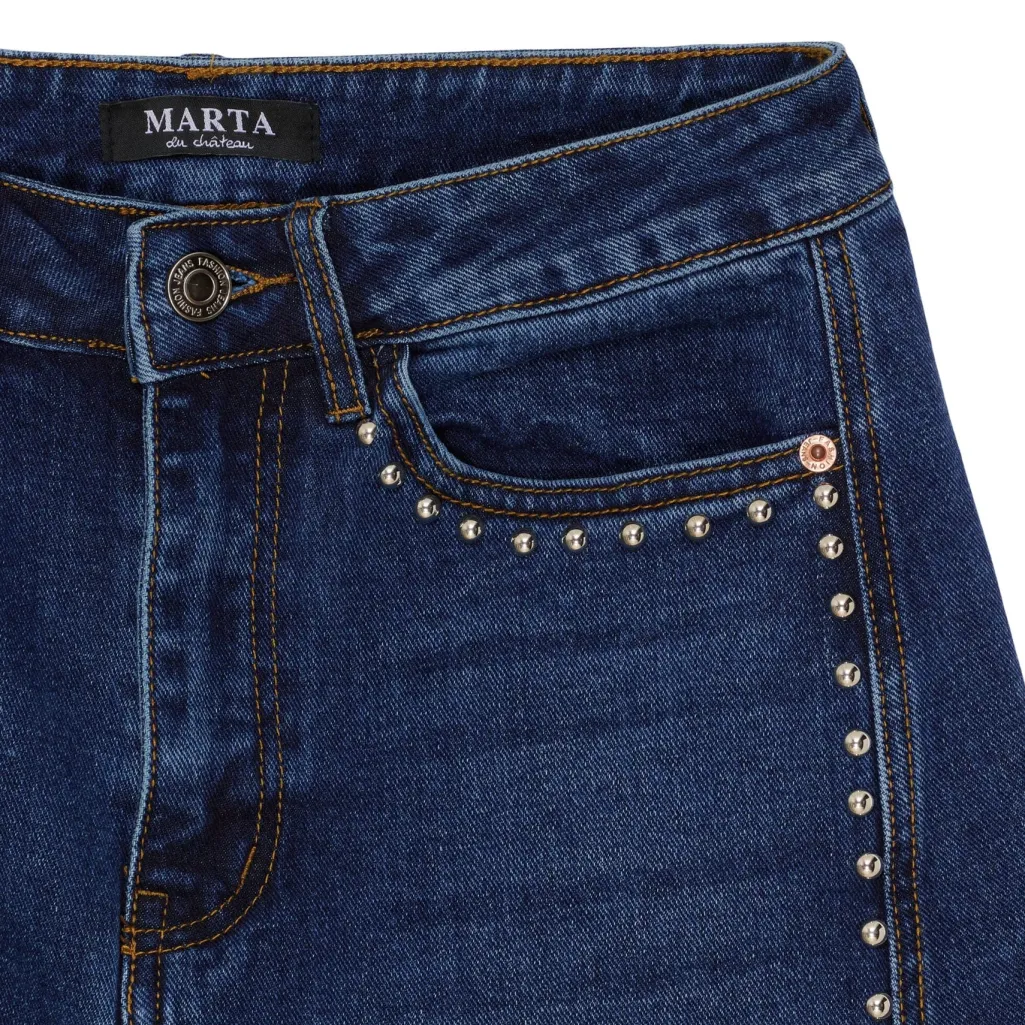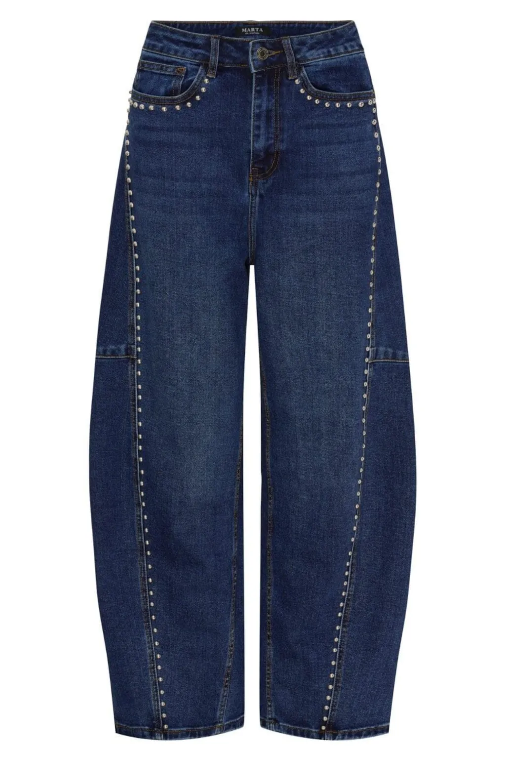 Mørkeblå jeans fra Marta Du Chateau med perledetaljer langs sidesømmene. Jeansene har en høj talje og loose fit med kalvelang længde.
