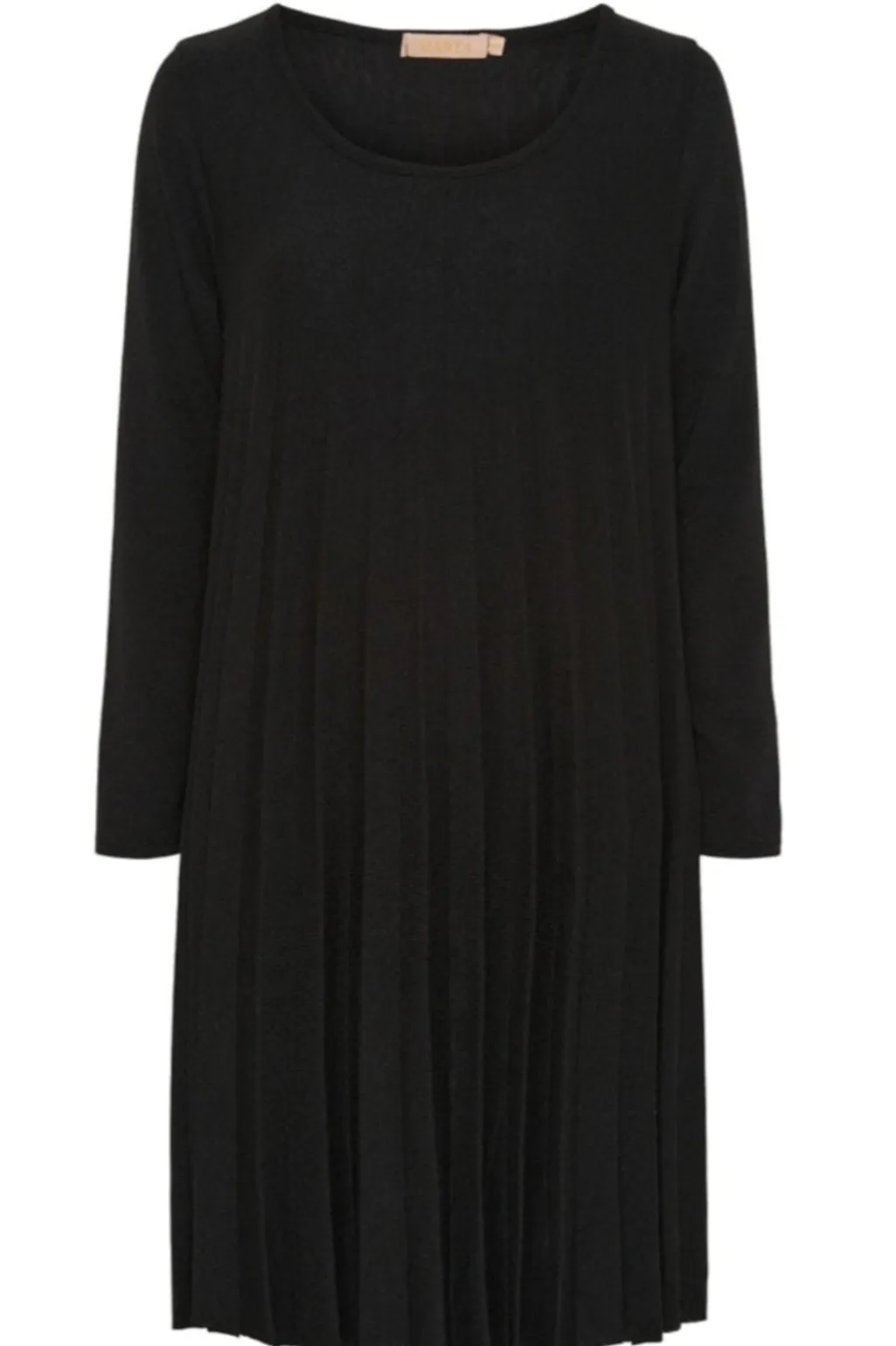 Sort kjole fra Marta Du Chateau med plisseret nederdel. Kjolen har rund halsudskæring, 3/4-ærmer og en løs pasform i knælængde.
