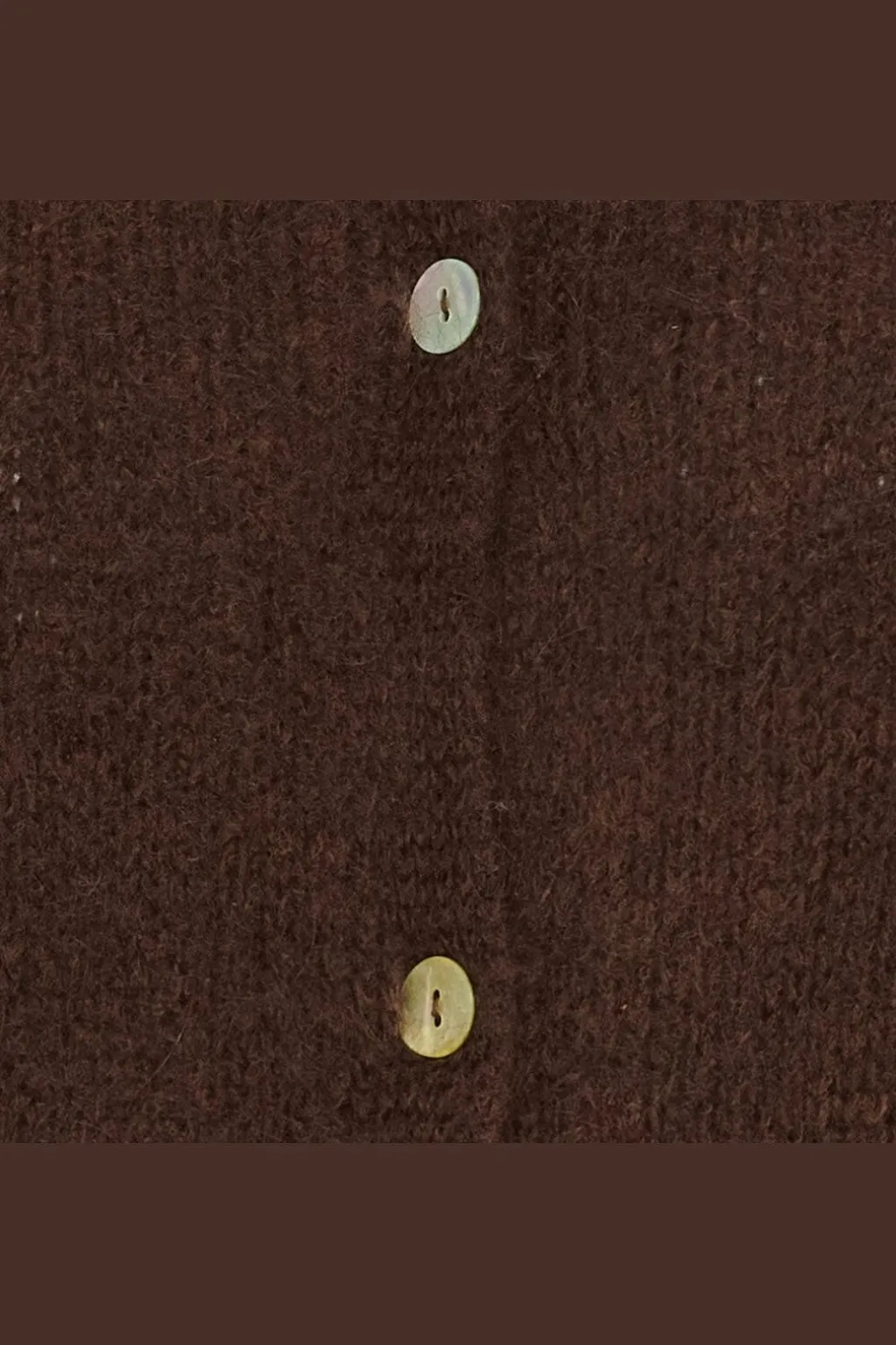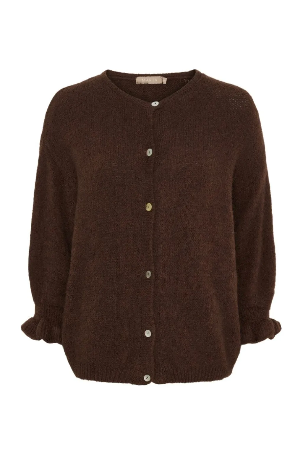 Brun cardigan fra Marta Du Chateau med rund hals og knaplukning. Strikket i en blød blanding af naturlige og syntetiske fibre med 3/4 ærmer.