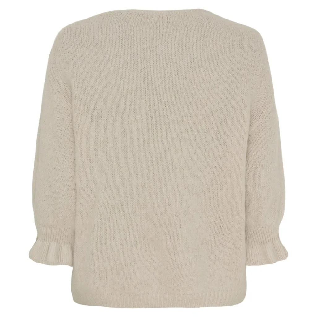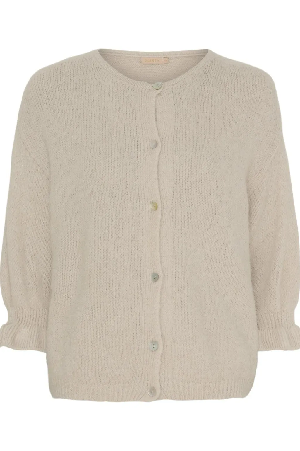 Beige strikket cardigan fra Marta Du Chateau med rund halsudskæring og 3/4 ærmer. Den bløde strik har en behagelig blanding af naturlige og syntetiske fibre.