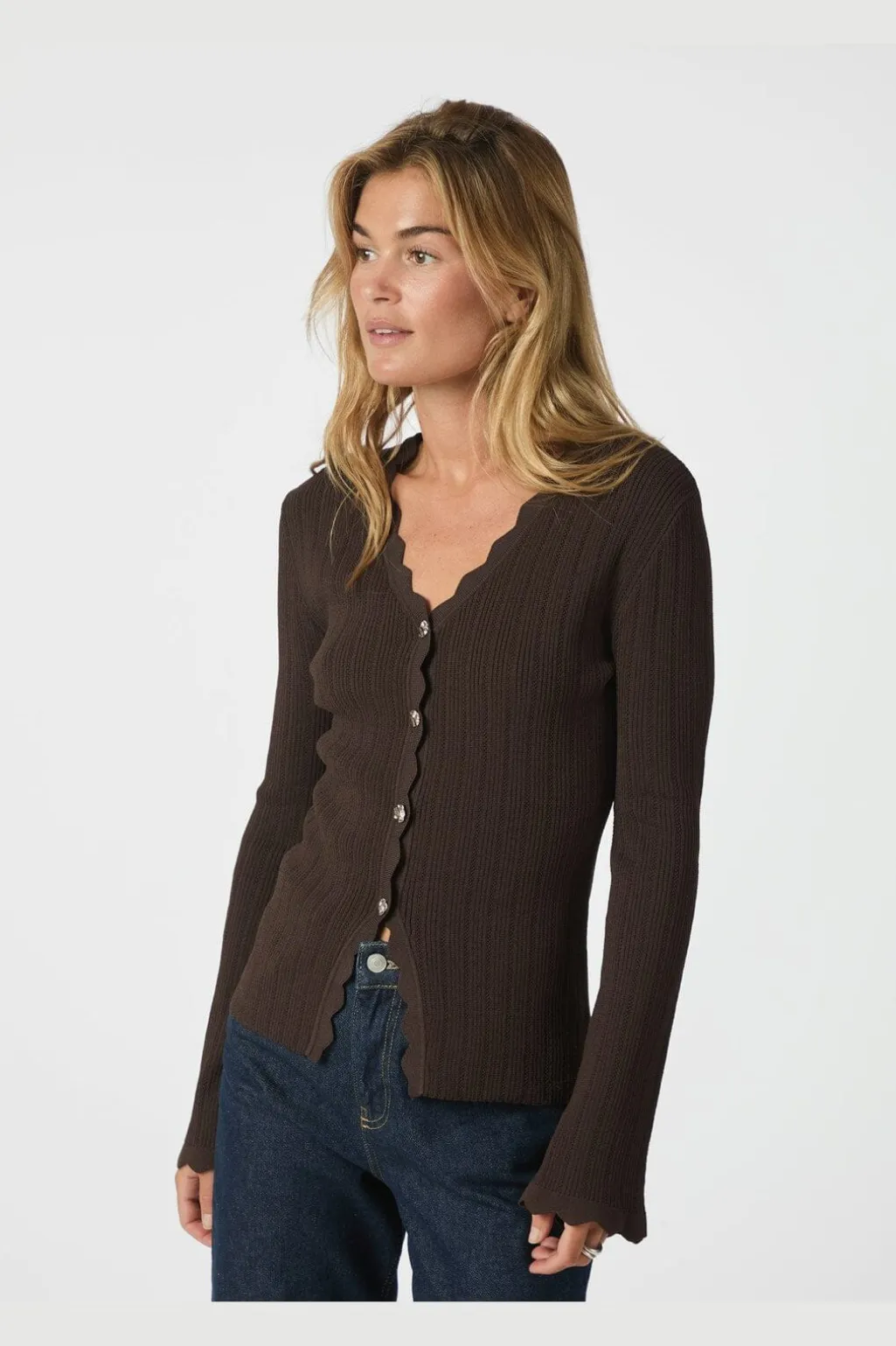 Mørkebrun strikket bluse fra Neo Noir med ribbet tekstur. Blusen har en V-halsudskæring med bølget kant og en tætsiddende pasform, der følger kroppens linjer.