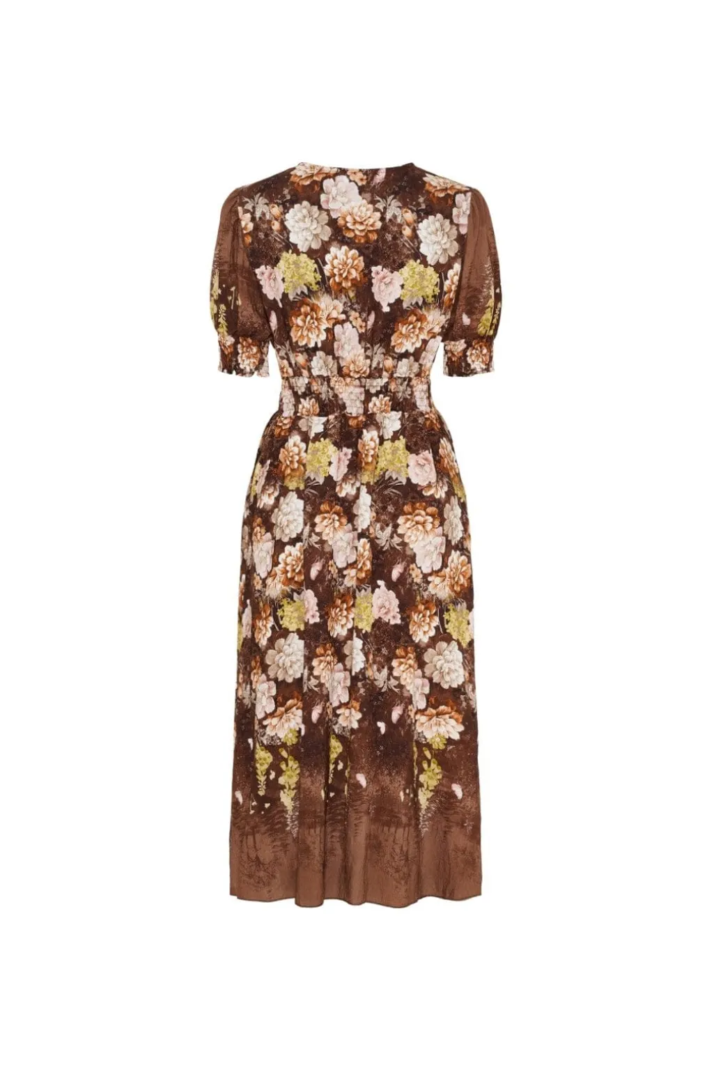 Brun kjole fra Marta Du Chateau med blomstermønster. Kjolen har V-hals, pufærmer og smock i taljen. Den går til midt på læggen og har dekorative syninger og flæser.