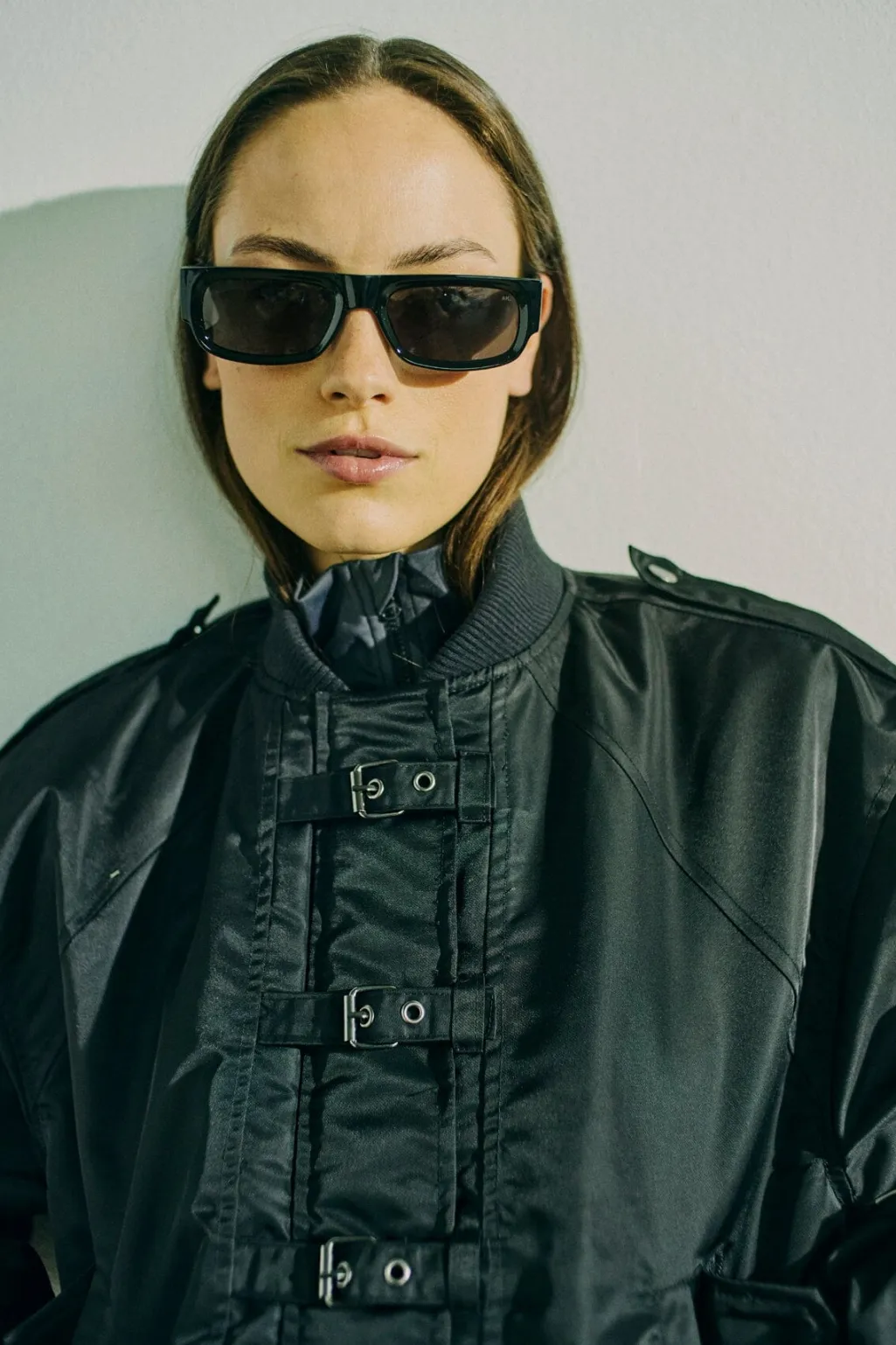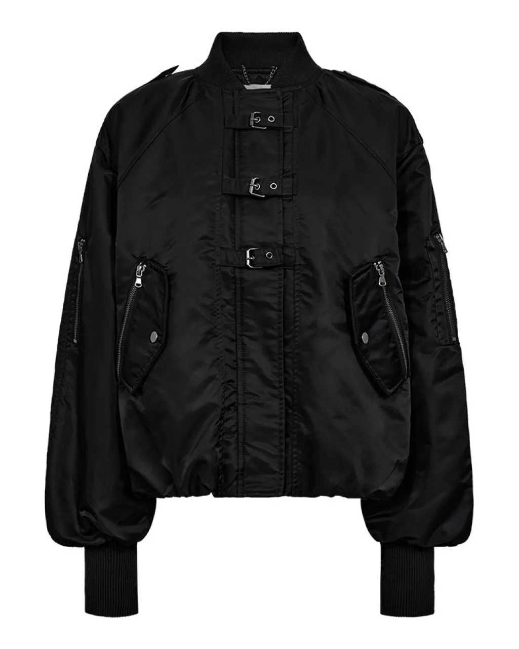 Sort bomberjakke fra Copenhagen Muse, lavet af 100 % polyester. Jakken har dekorative syninger, flere spænder og lynlåslommer både på fronten og ærmerne.