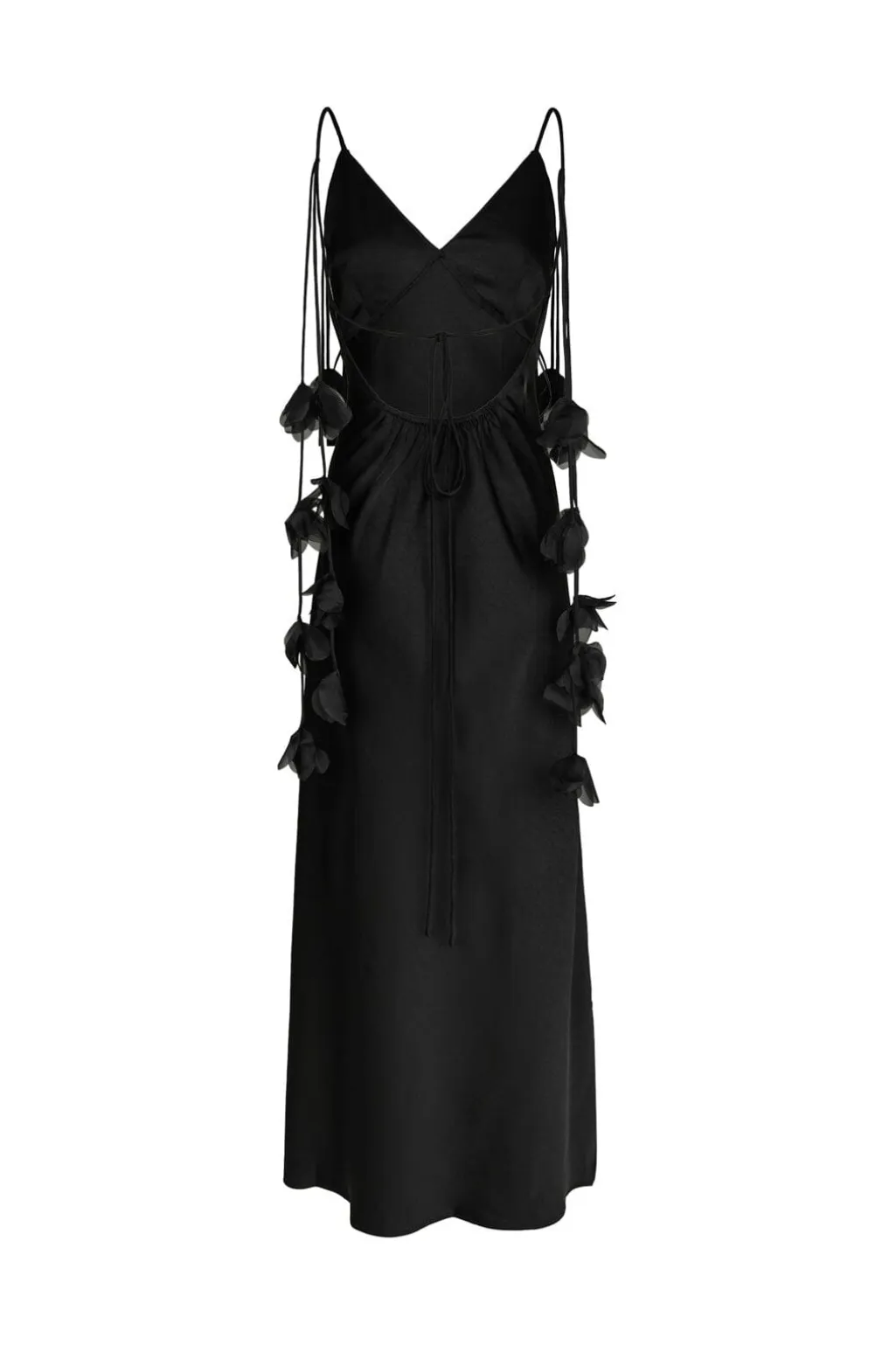 Sort gulvlang kjole fra Neo Noir i tung crepe-satin. Kjolen har V-udskæring, spaghetti-stropper med blomsterdetaljer og bindebånd på ryggen.